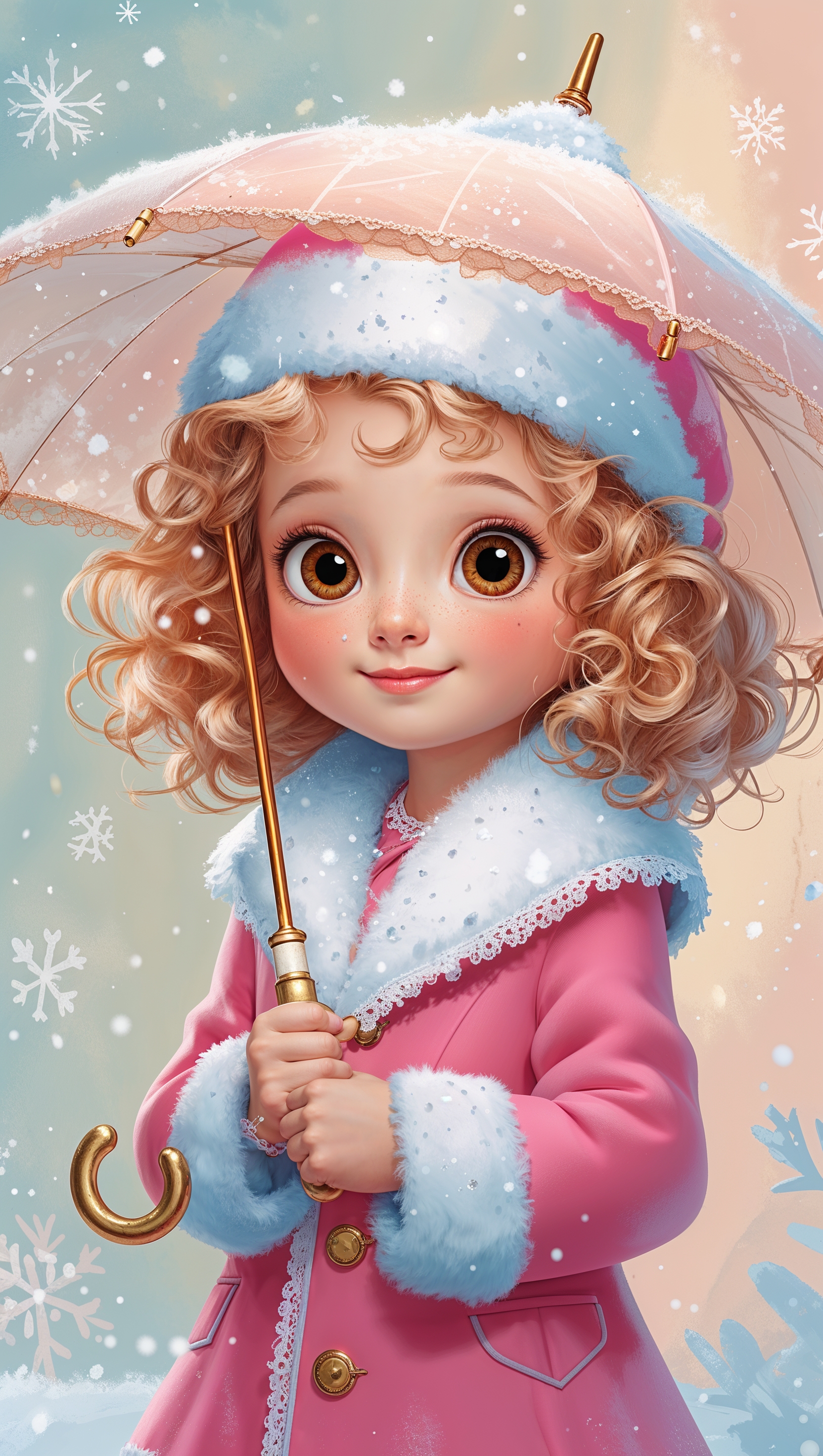 1664x2944 Cute cartoon girl holding umbrella under soft snowfall, pastel background