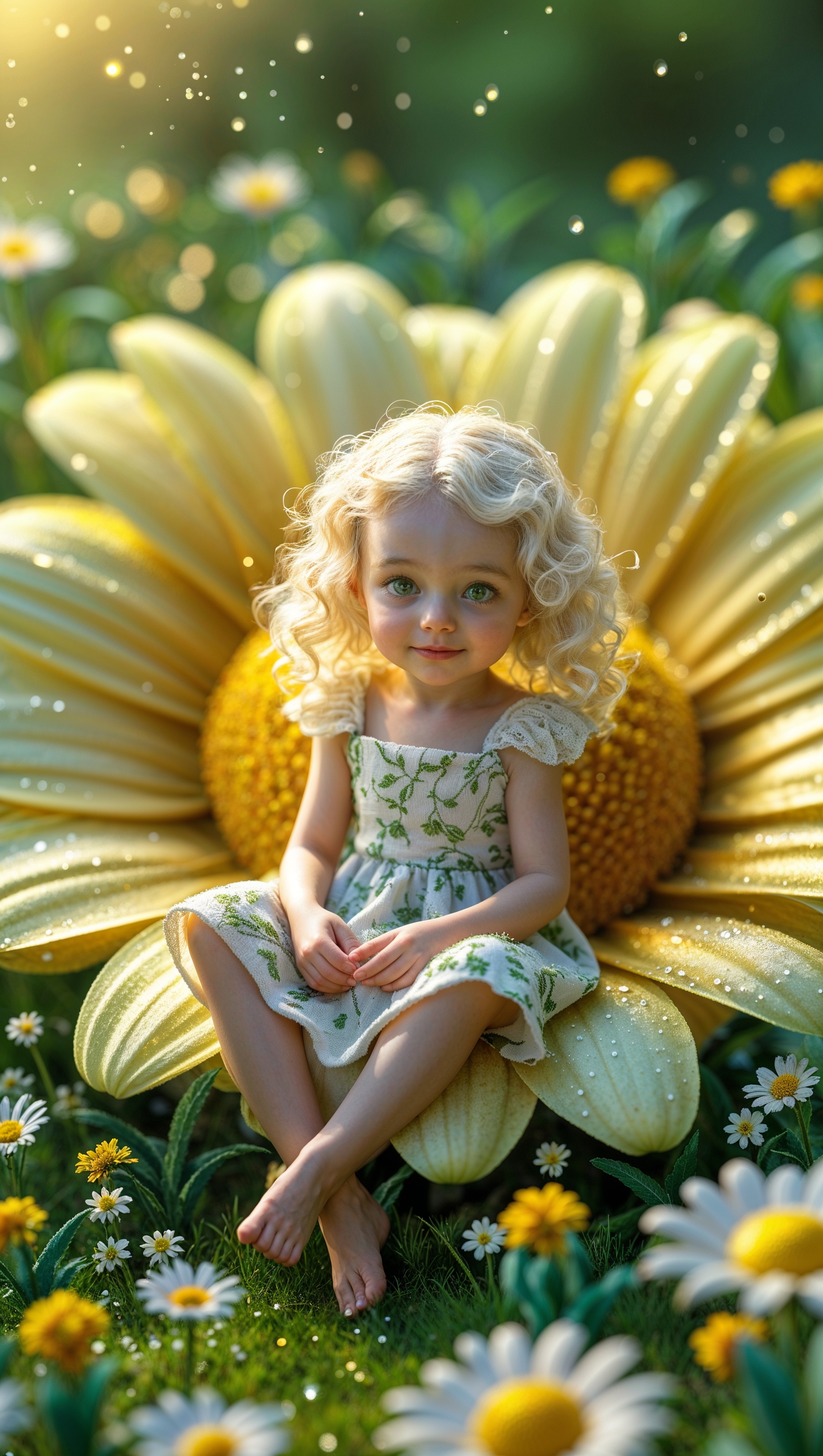 1664x2944 Tiny girl sitting on a daisy flower petal, magical miniature world