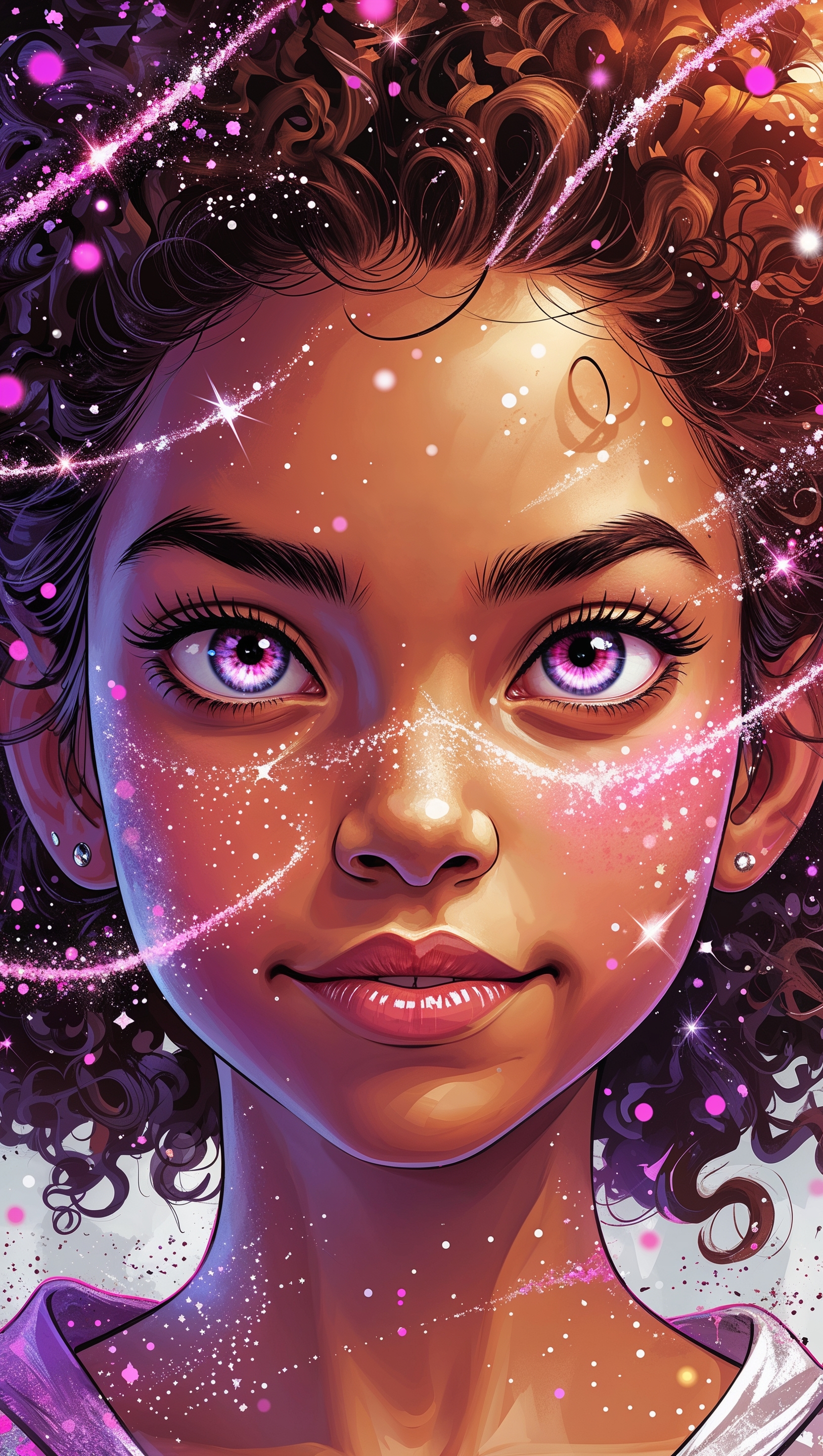 1664x2944 Girl with powerful expression and sparkles around her face, digital art