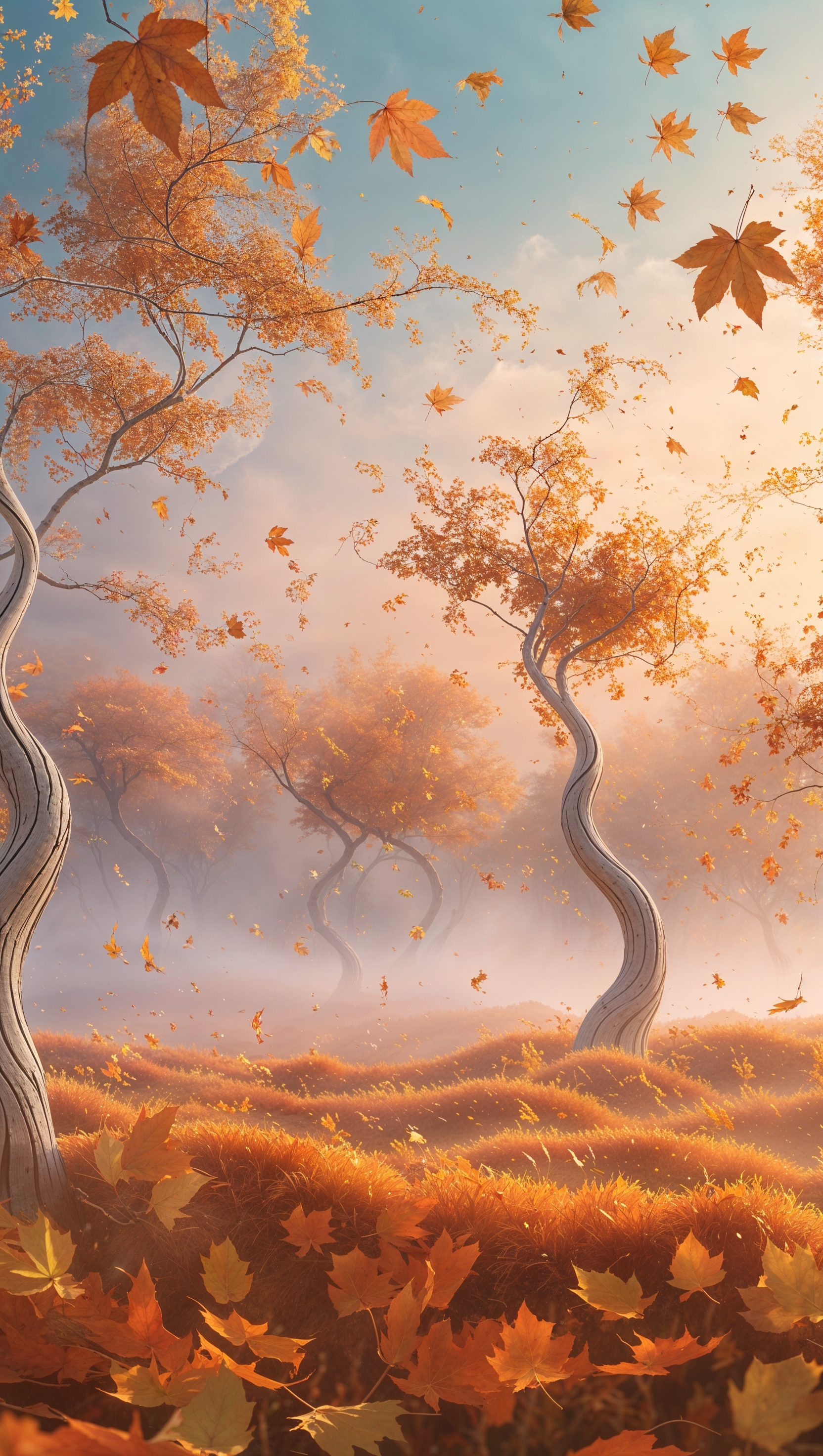 1664x2944 Surreal fall landscape with floating golden leaves and curved trees