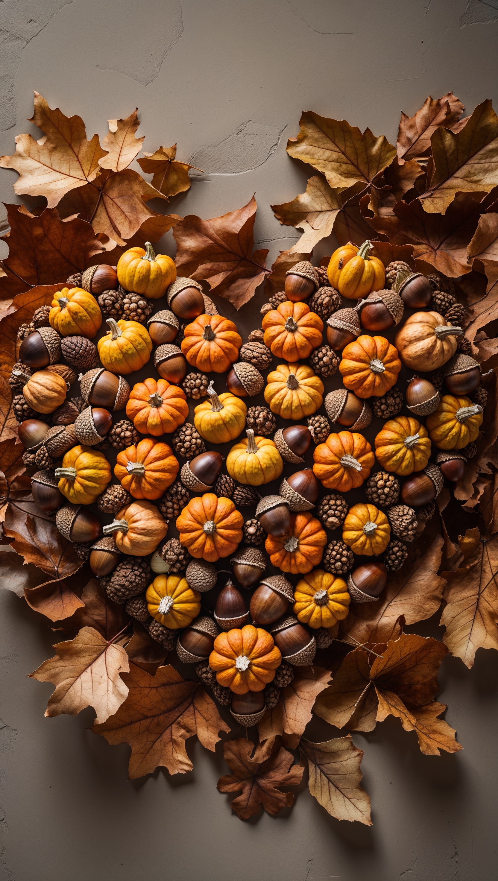 1664x2944 Heart shape made of acorns and mini pumpkins on dry leaves