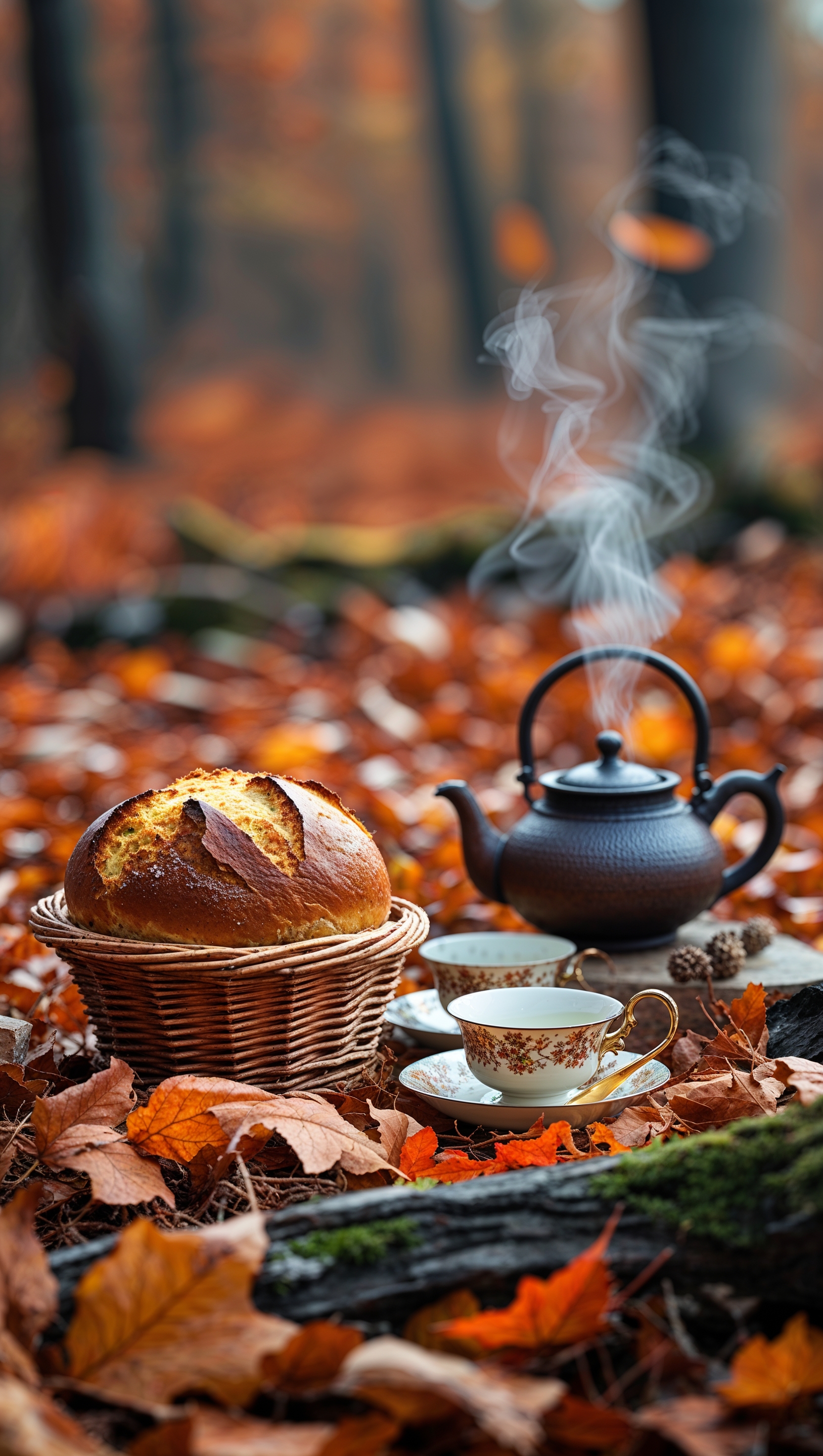 1664x2944 Aesthetic fall picnic setup with bread, tea, and dry leaves in soft focus