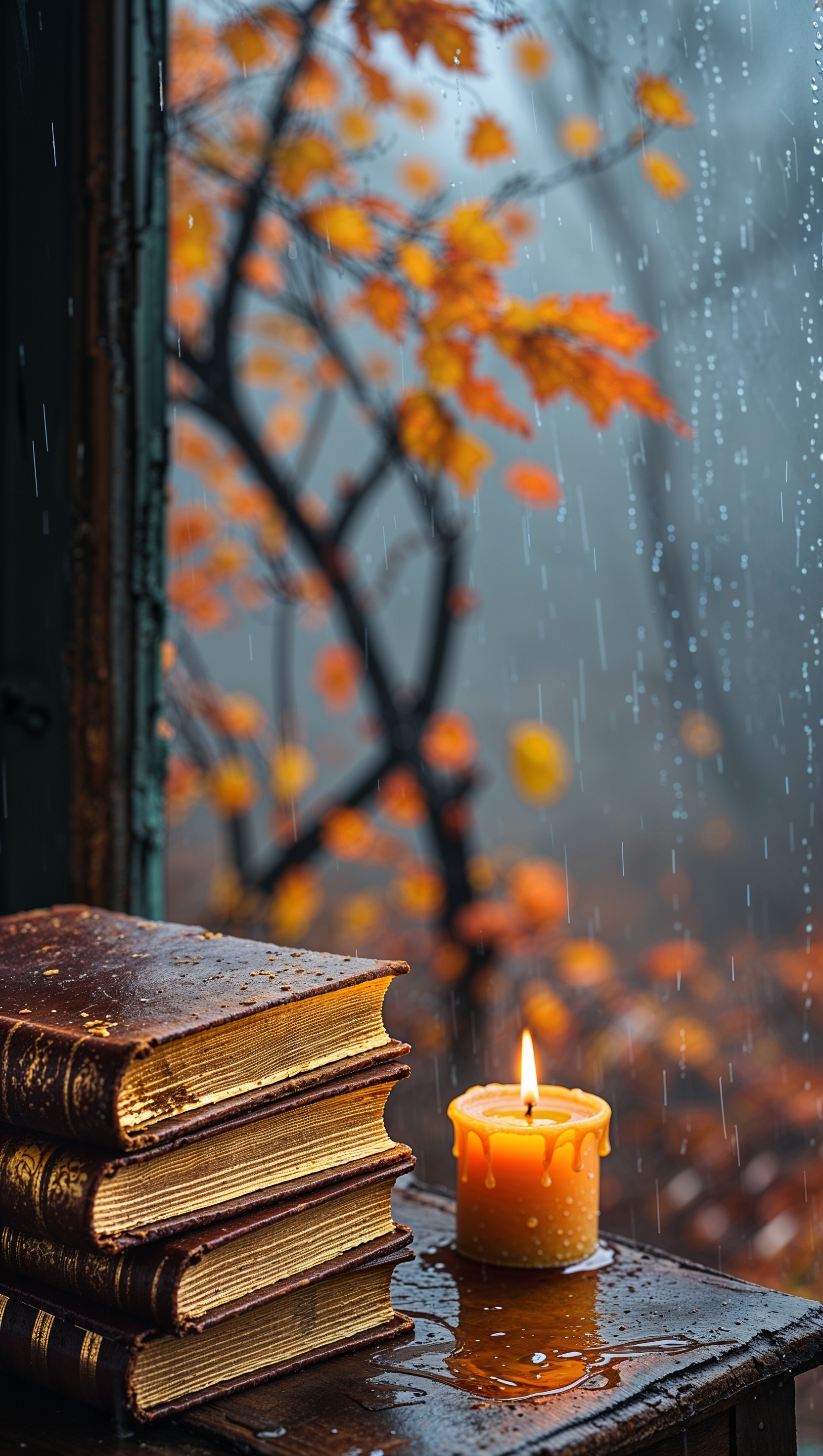 1664x2944 Stack of books near a candle with window view of rainy autumn day