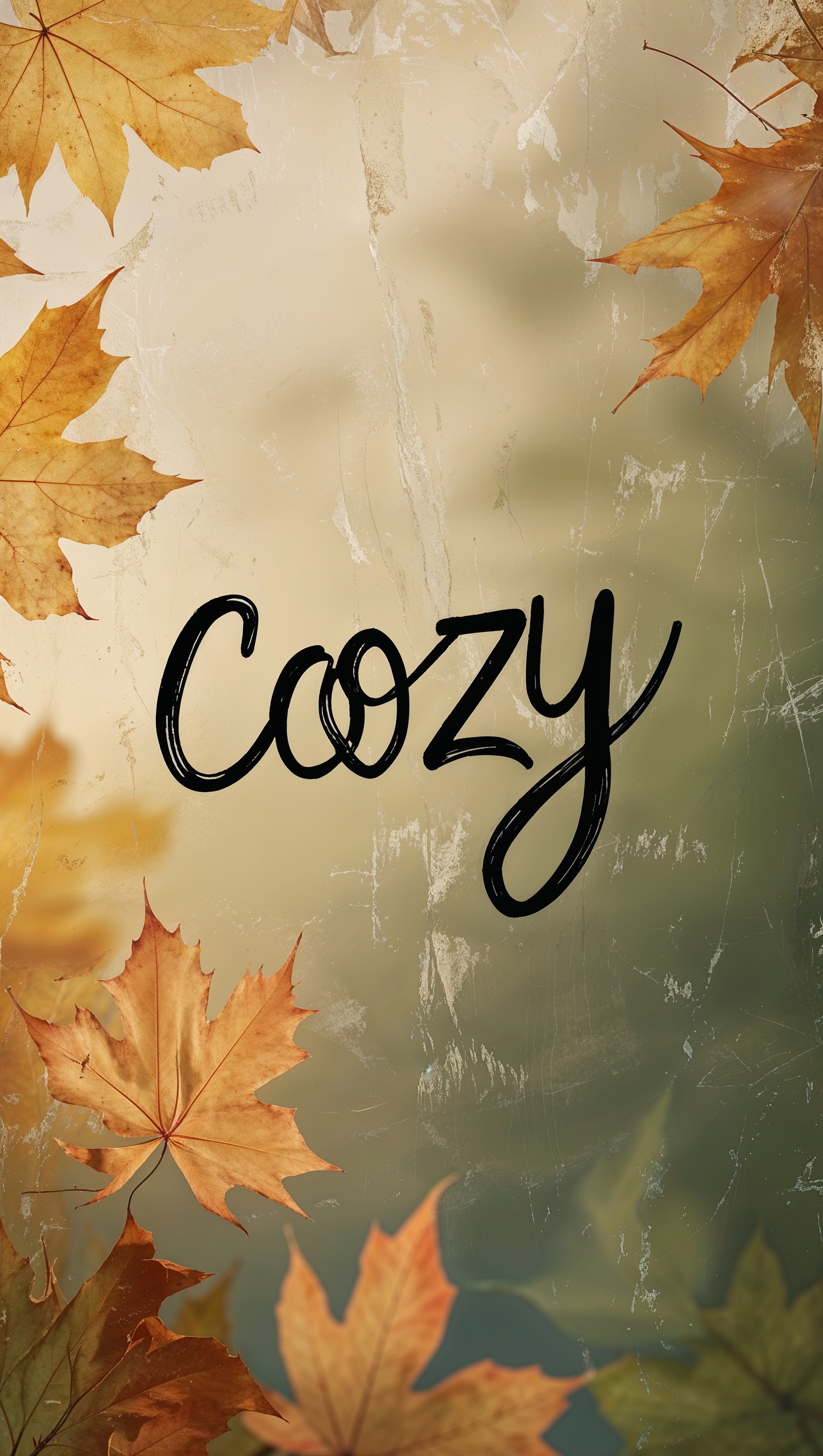 1664x2944 Vertical composition with word “cozy” in handwriting font over blurred leaves