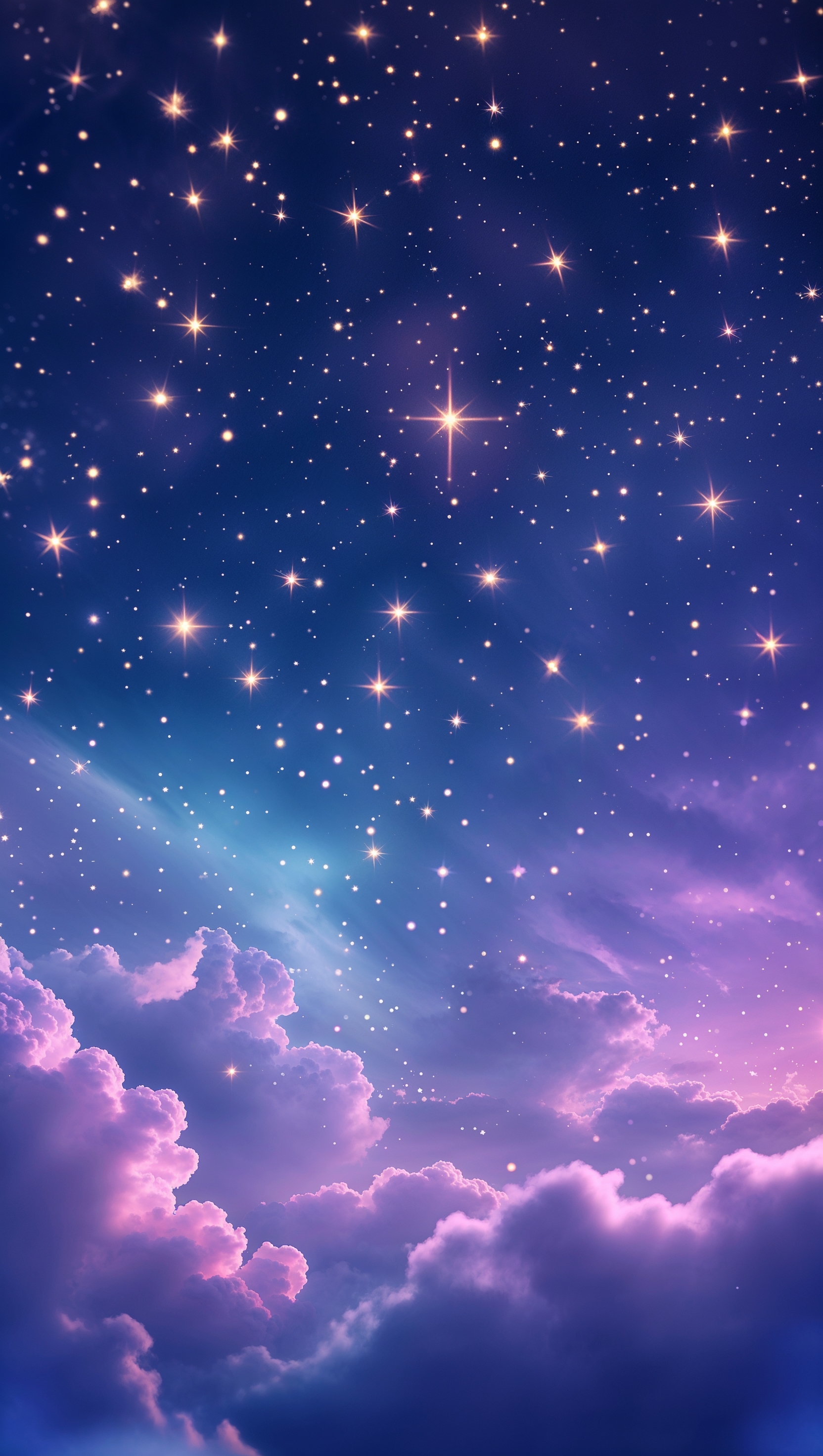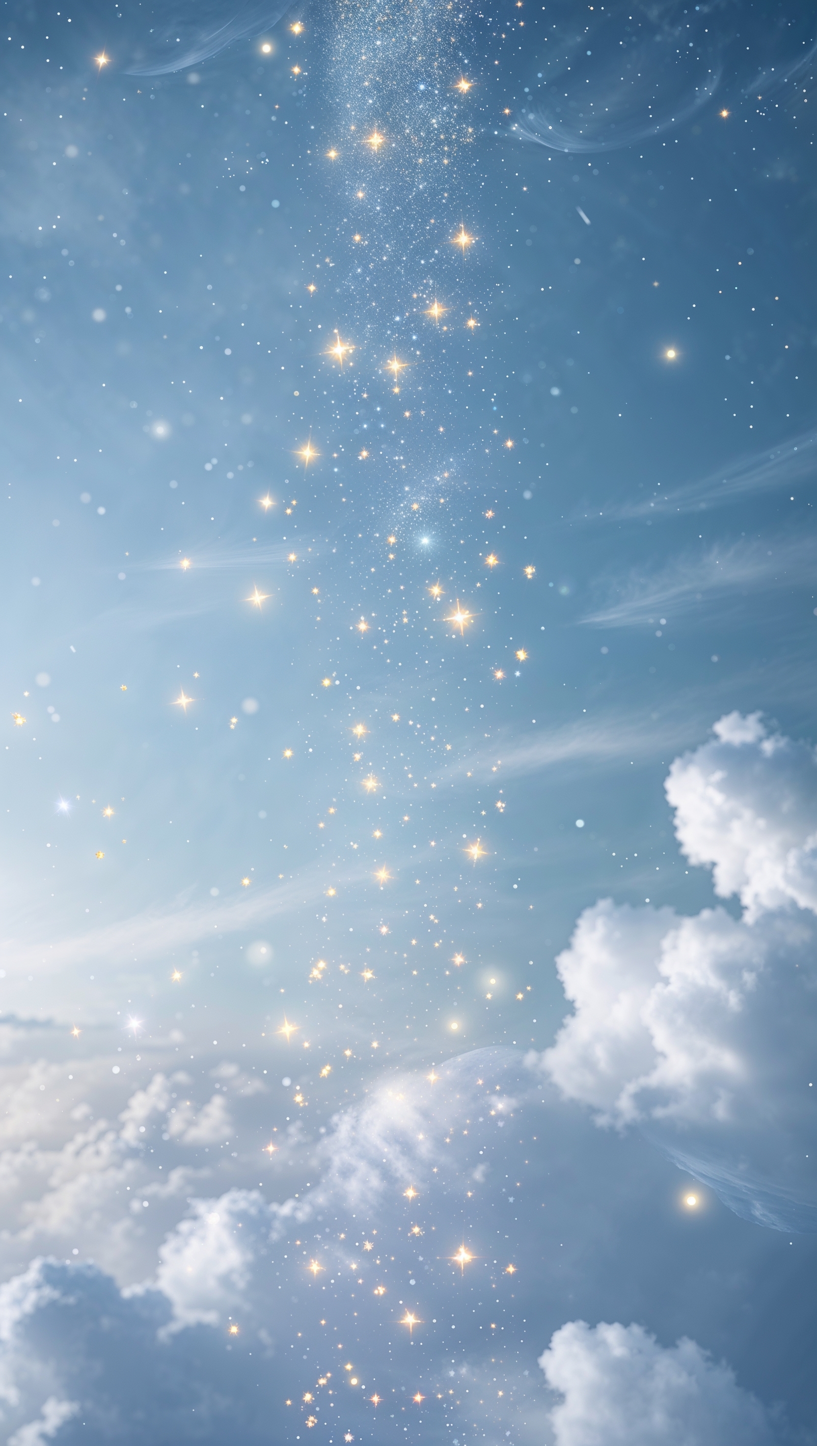 1664x2944 Floating glitter stars on a vertical blue sky with soft clouds