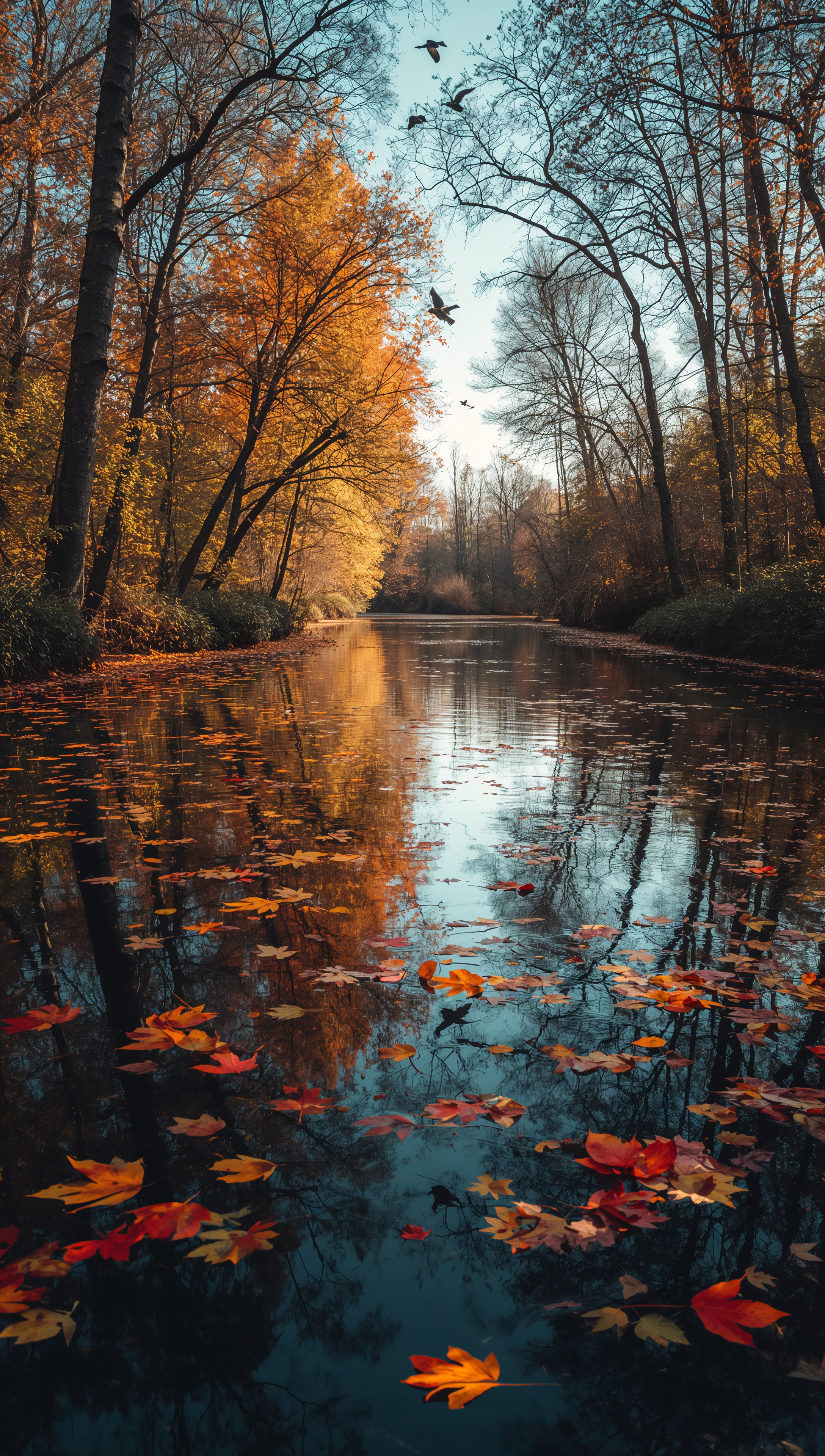 2176x3840 October iPhone wallpaper – river with autumn leaves