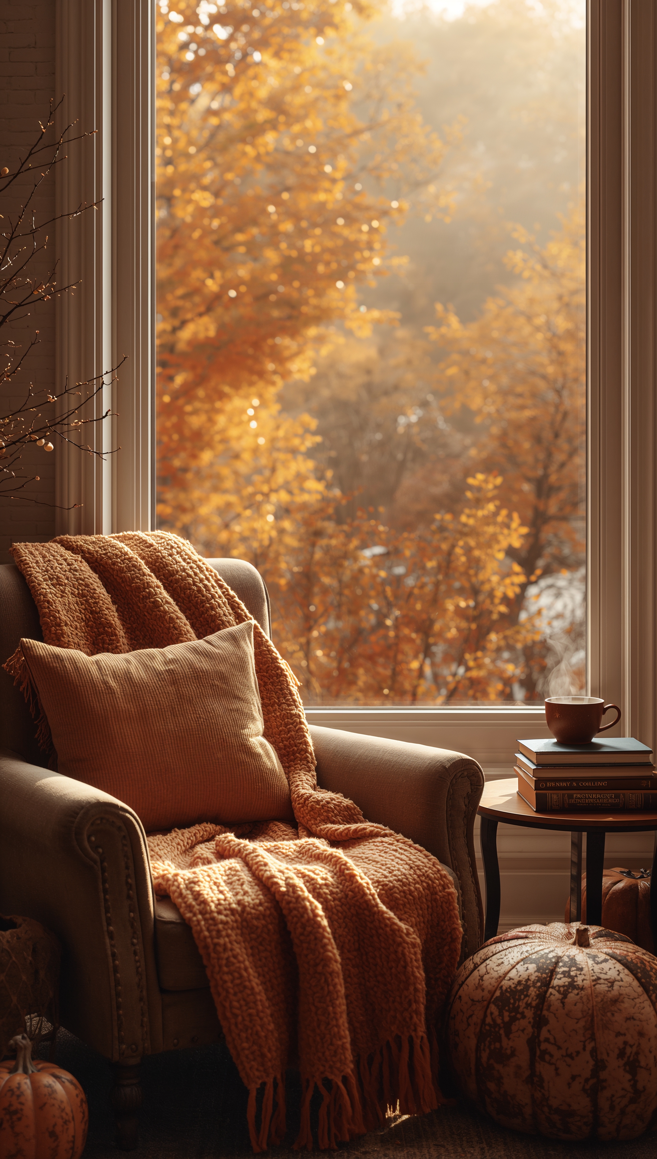 2176x3840 October iPhone wallpaper – cozy autumn reading corner