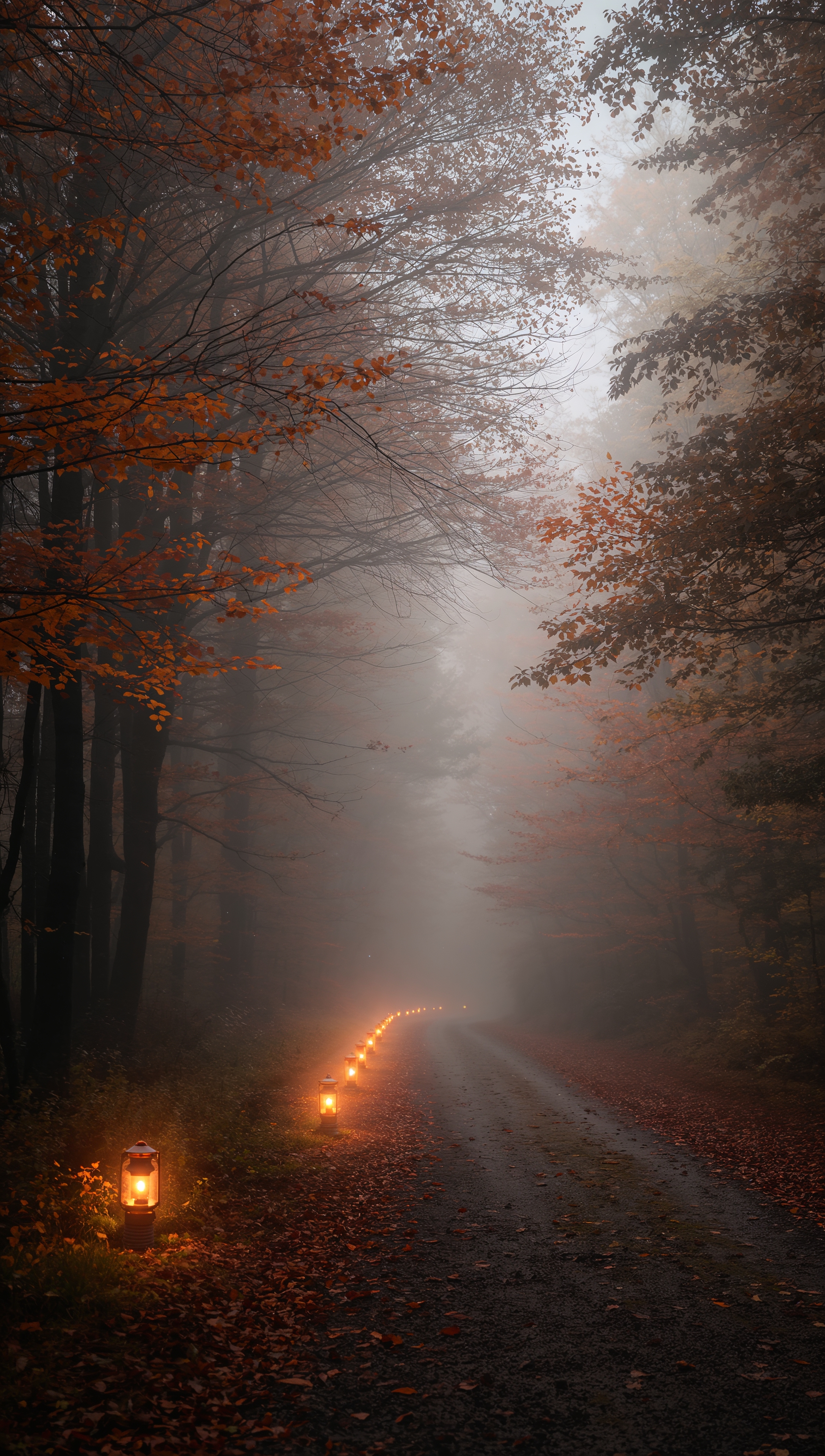 2176x3840 October iPhone wallpaper – lanterns in autumn fog