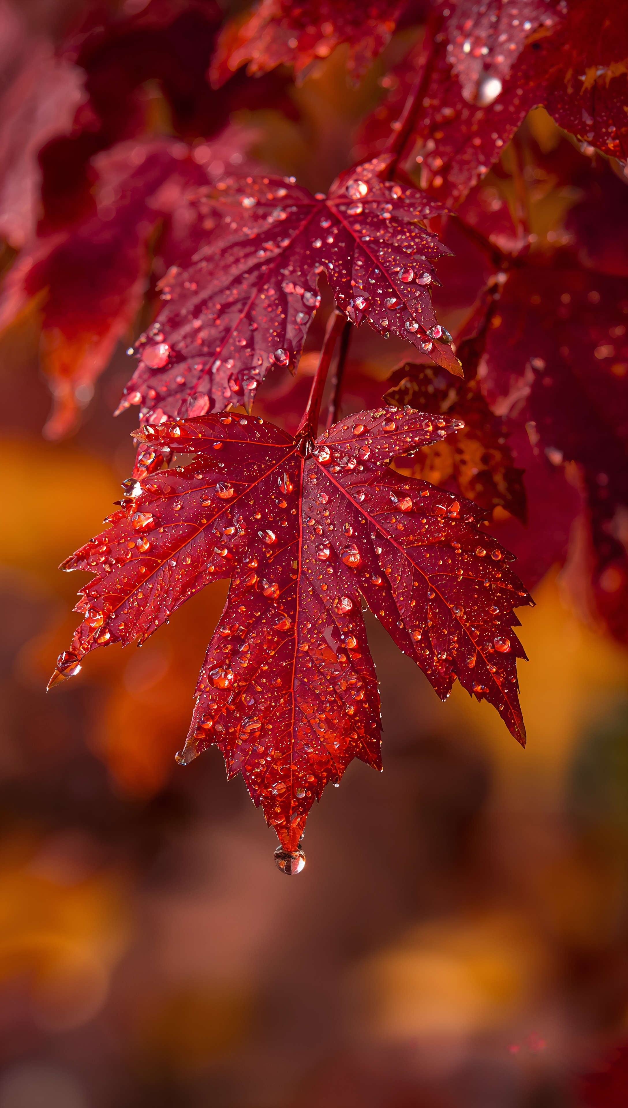 2176x3840 October iPhone wallpaper – dew on red autumn leaves