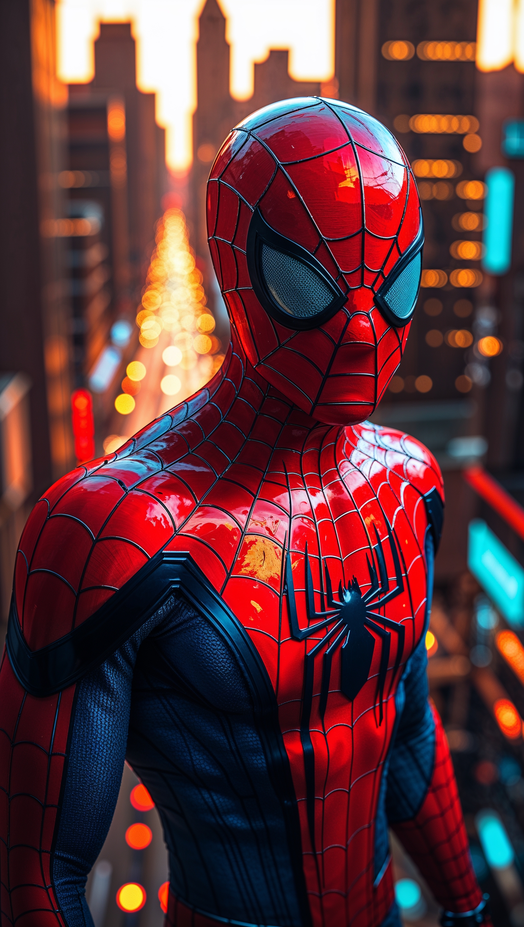 1664x2944 Spider-Man at night with neon lights and a skyline of tall towers