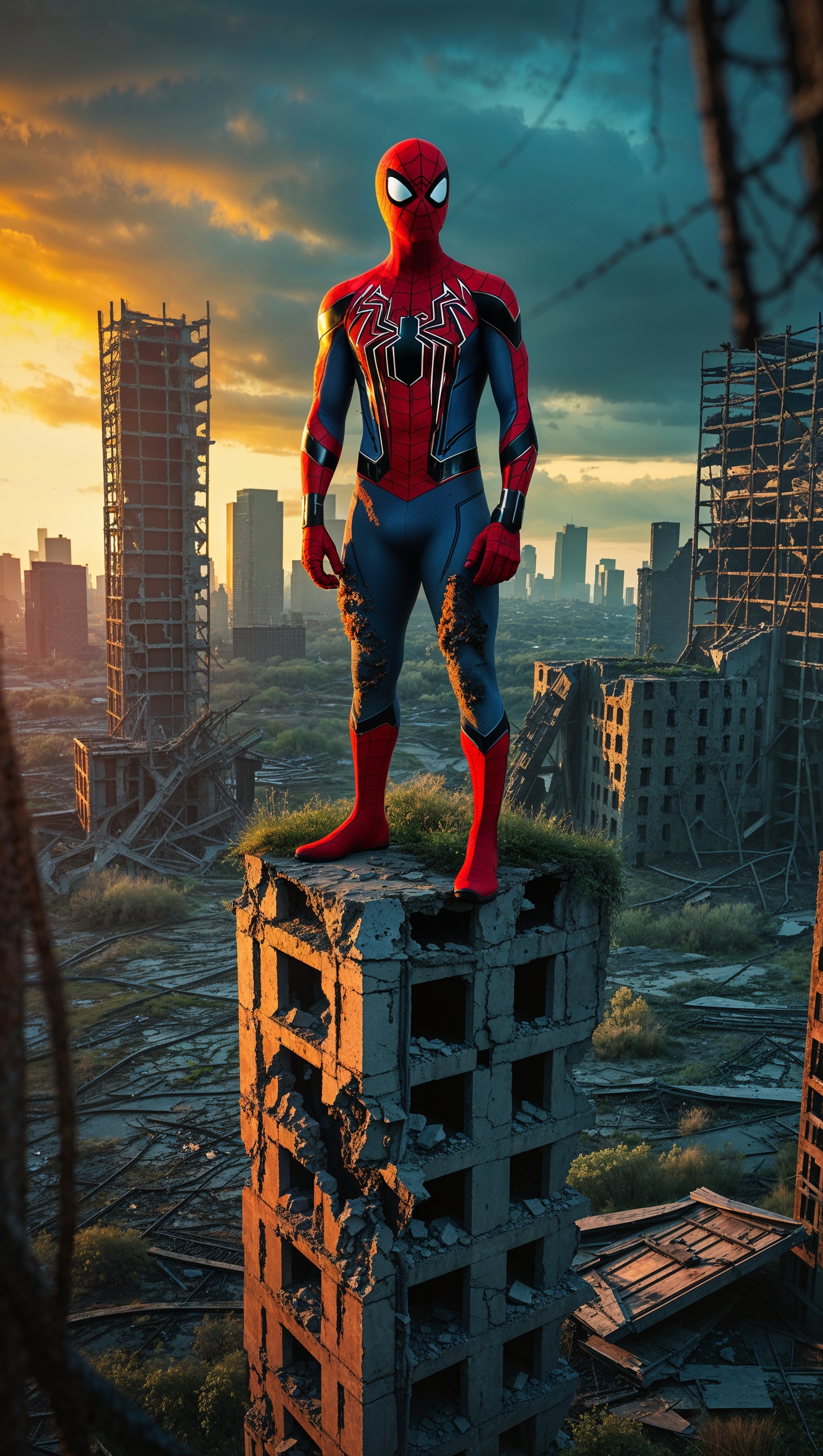 1664x2944 Spider-Man in a post-apocalyptic world with a ruined city