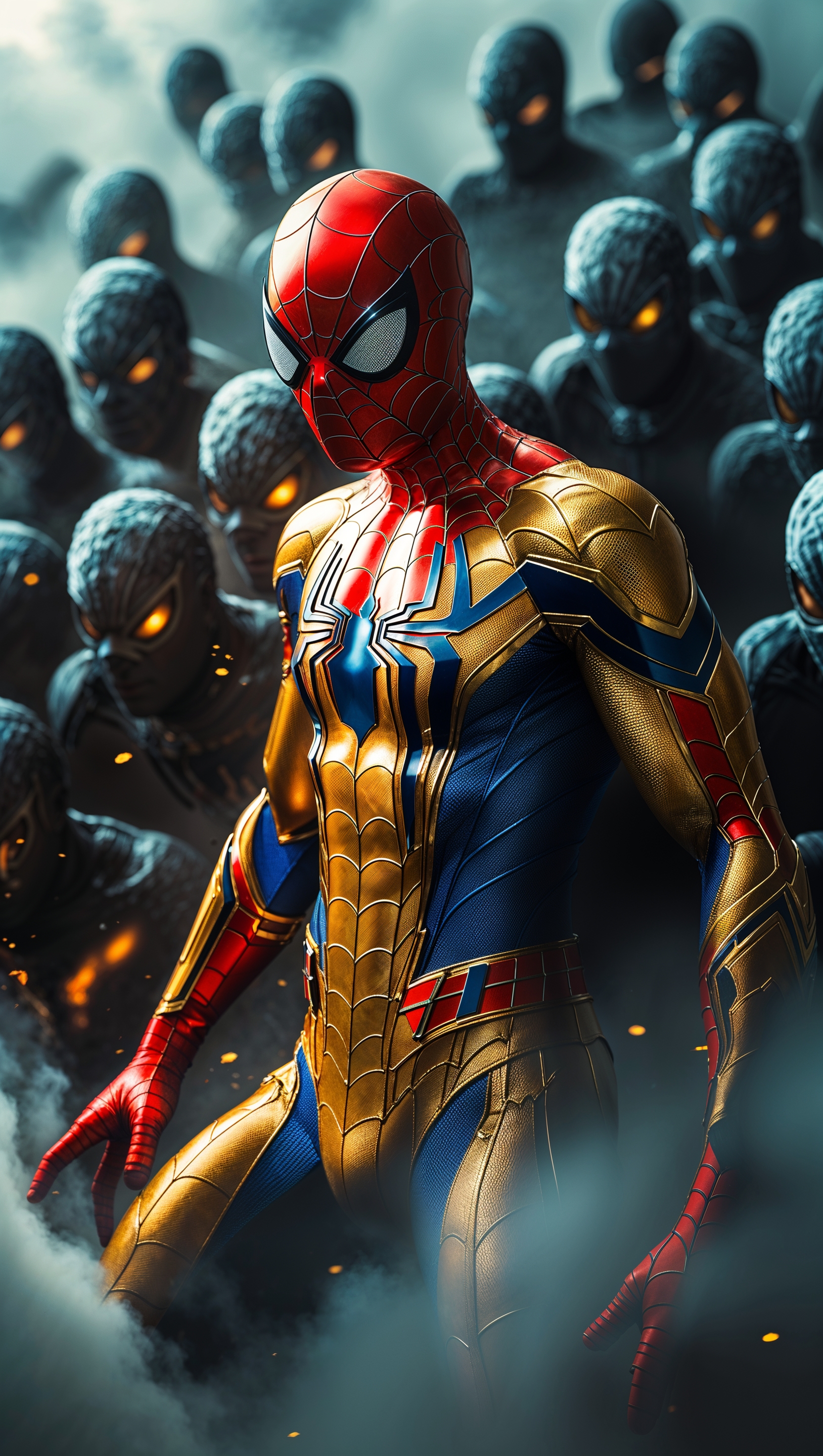 1664x2944 Spider-Man in golden armor battling shadowy enemies