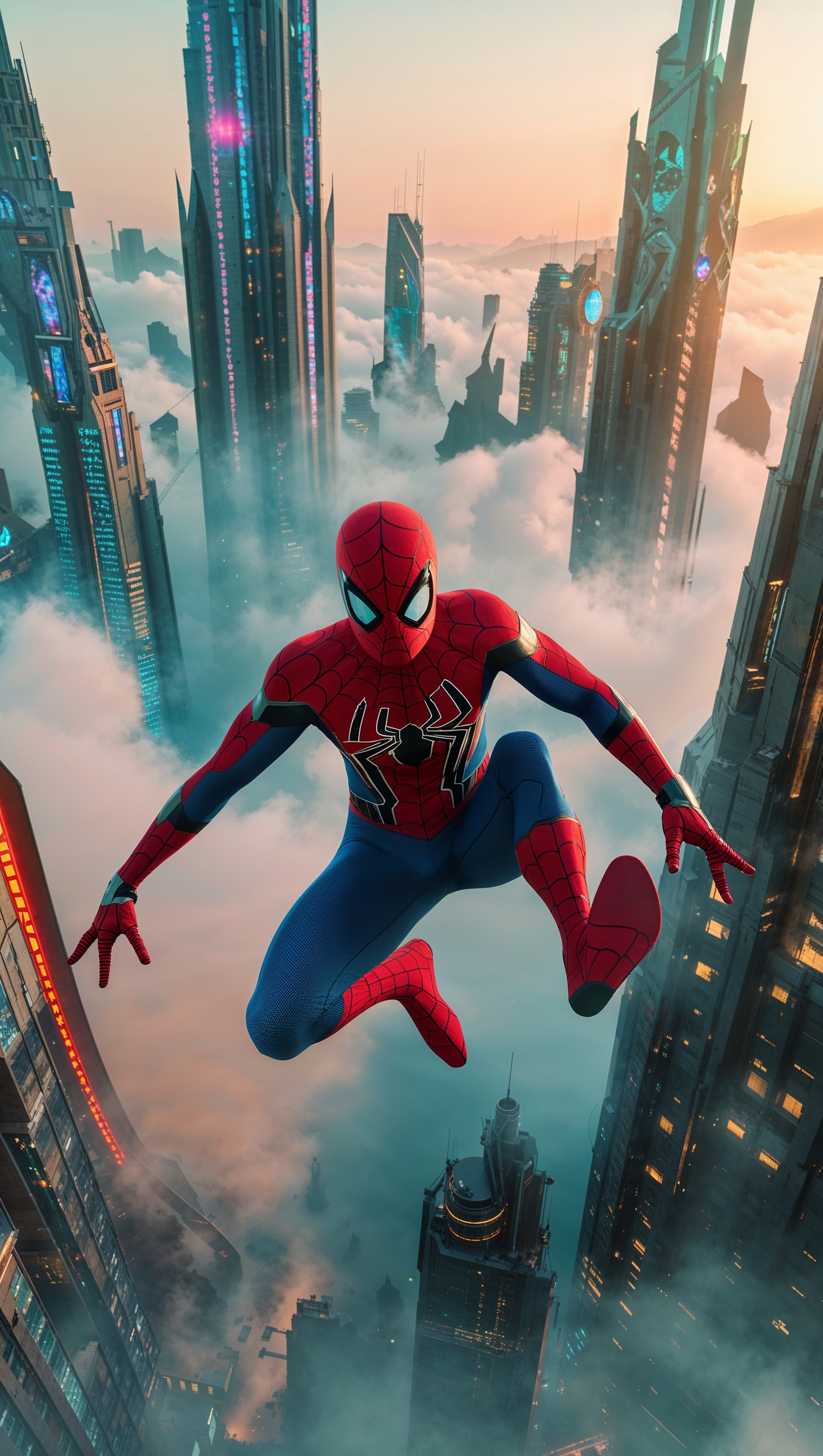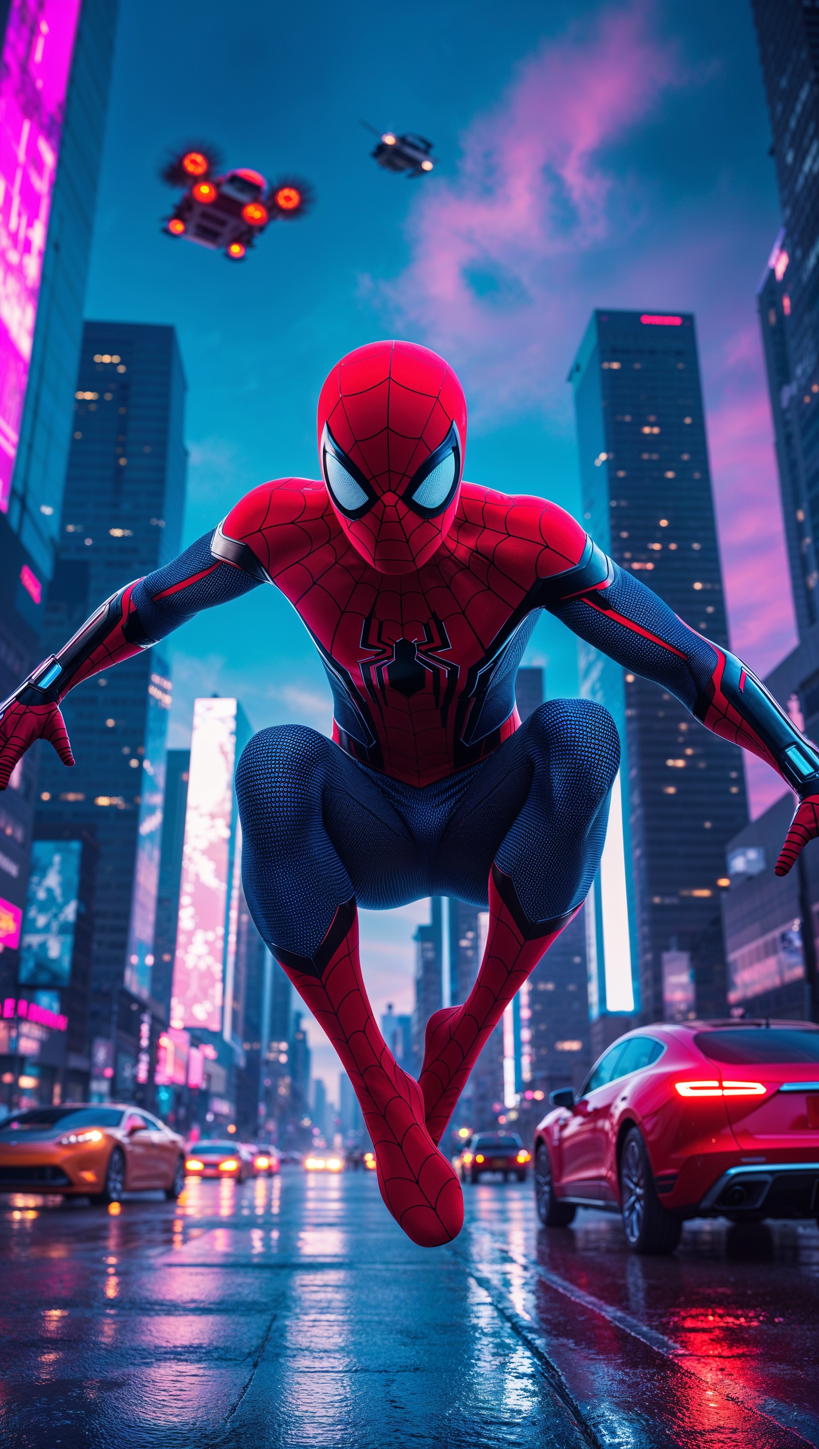1664x2944 Spider-Man in a futuristic world with flying cars and high technology