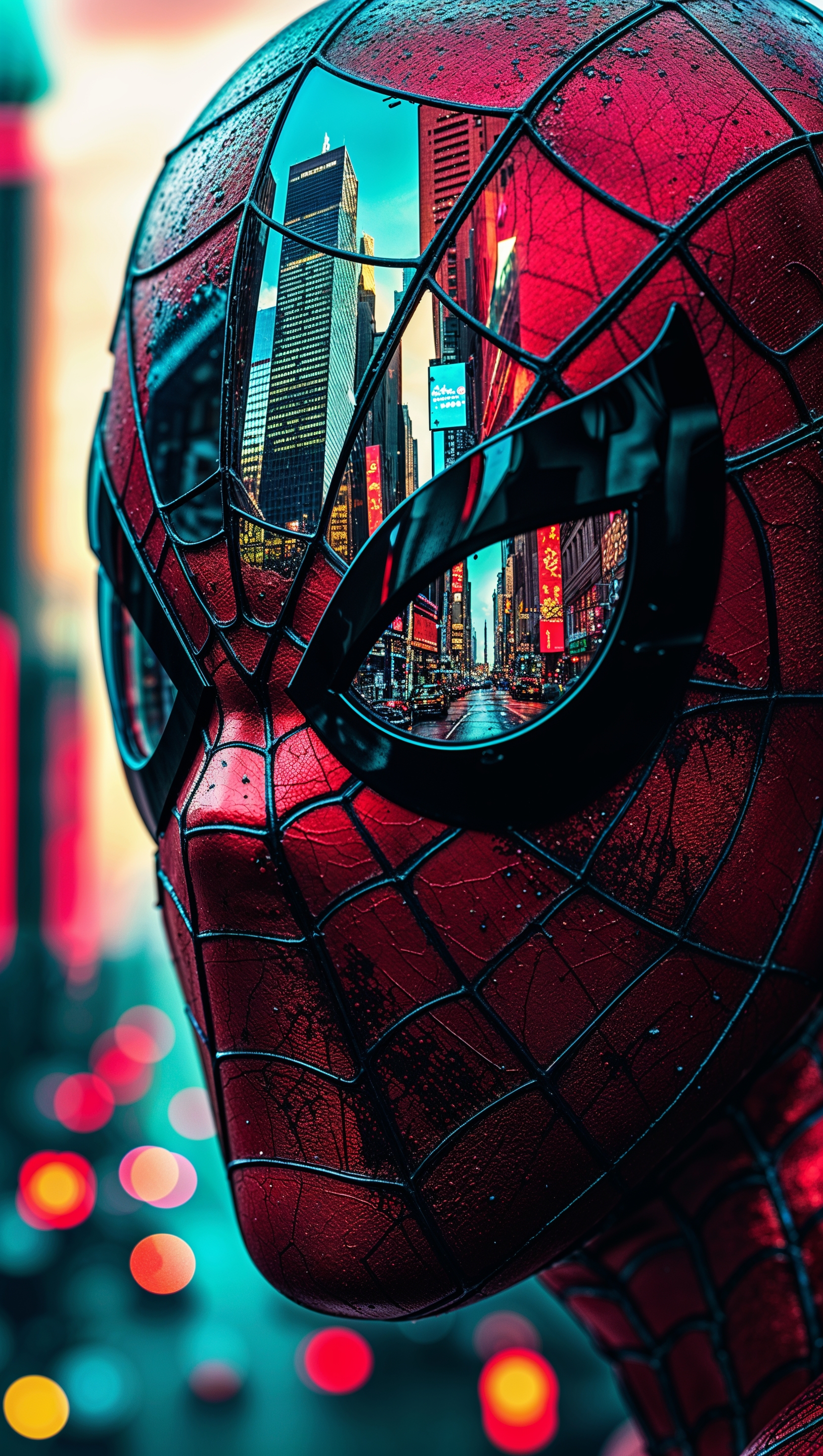 1664x2944 Close-up of Spider-Man with the city reflected in his mask eyes