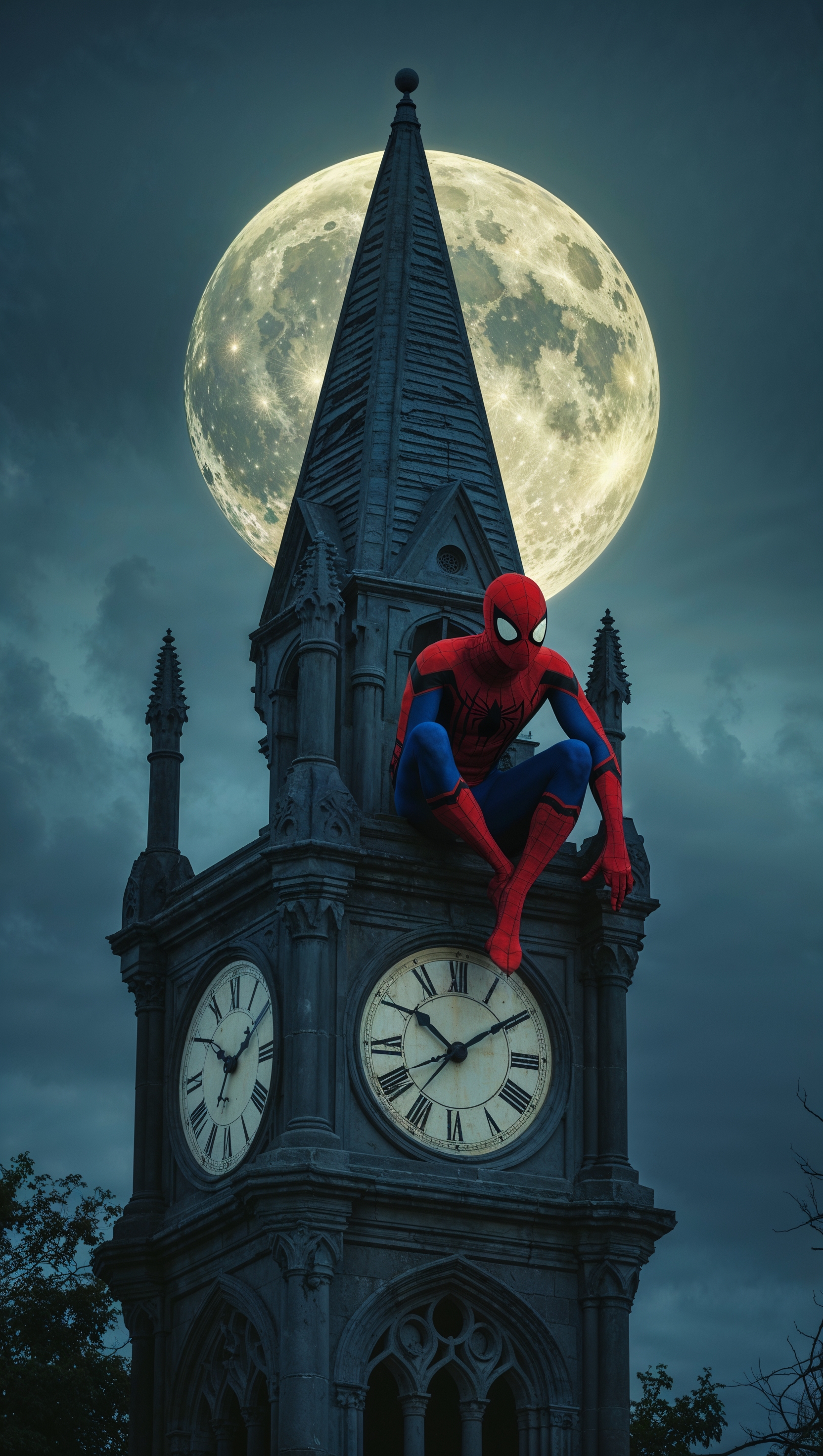 1664x2944 Spider-Man on an old clock tower under the moonlight