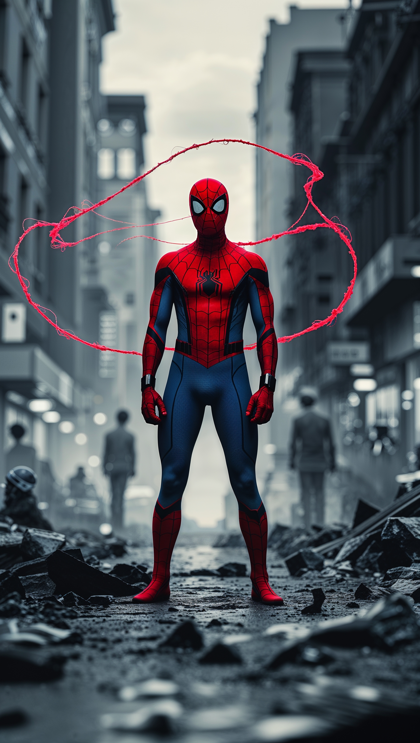 1664x2944 Spider-Man in a black and white world with a single red web