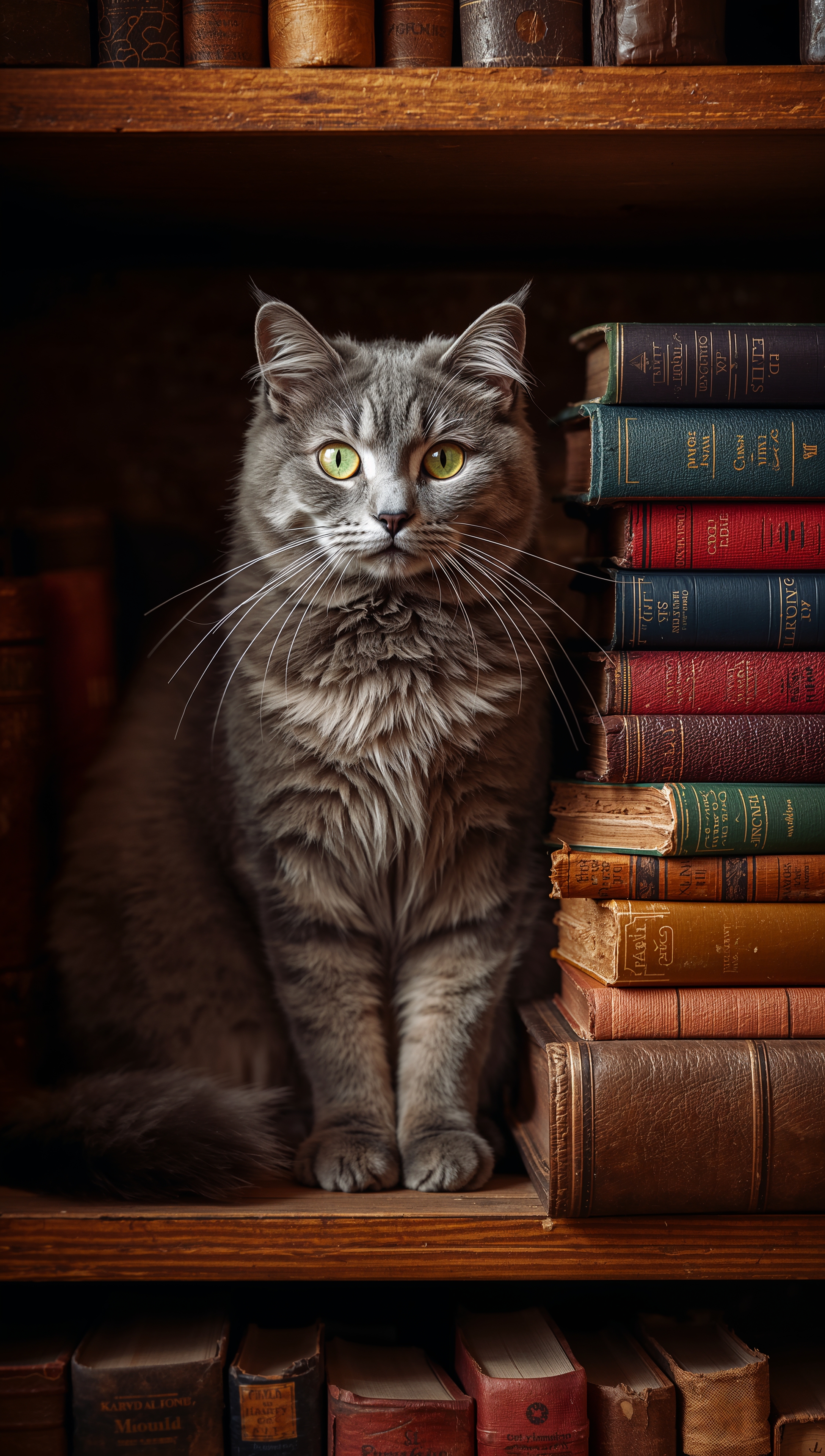 2176x3840 Cat sitting on bookshelf among books, cozy iPhone wallpaper
