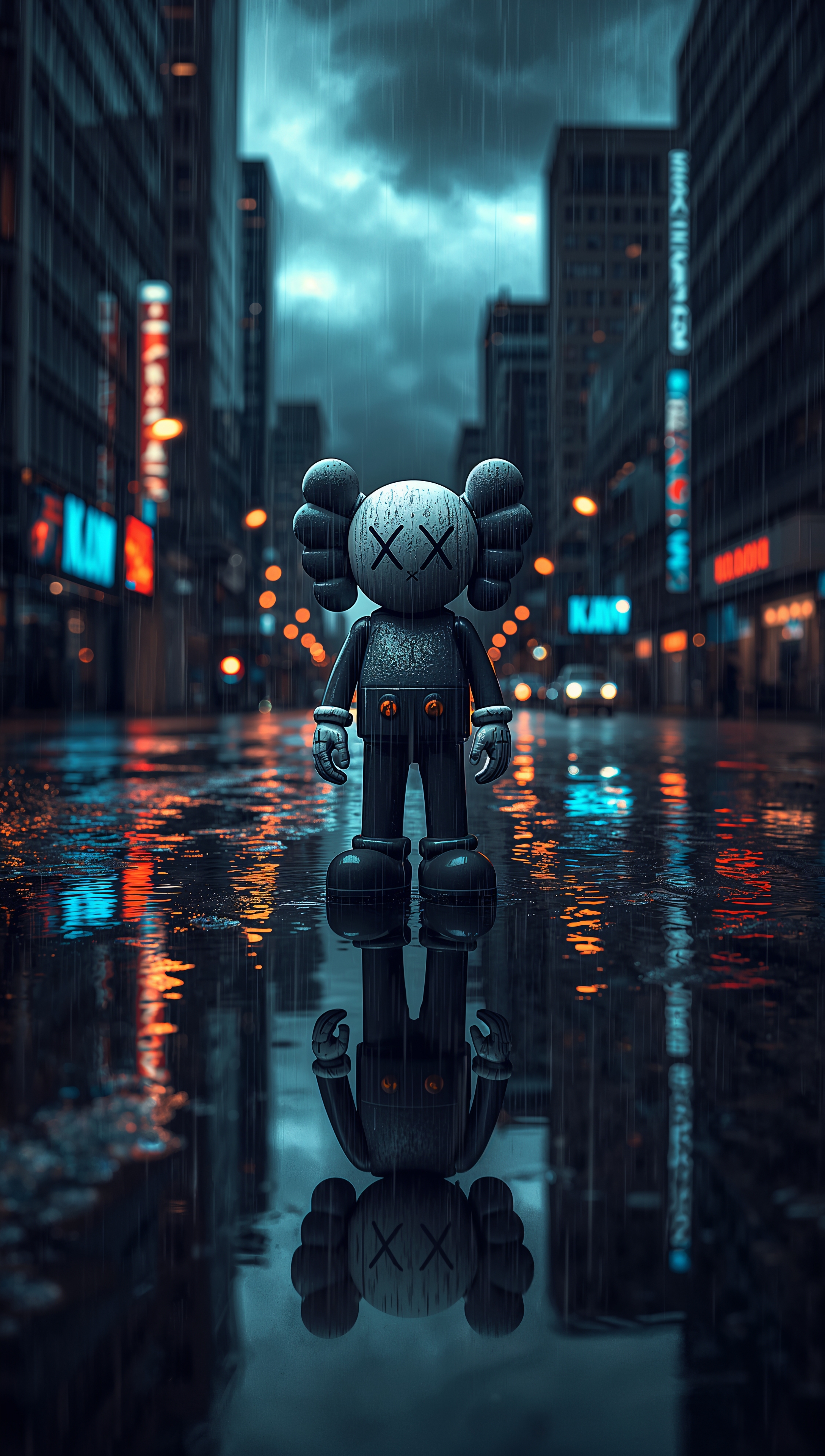 2176x3840 Kaws iPhone wallpaper – rainy city figure