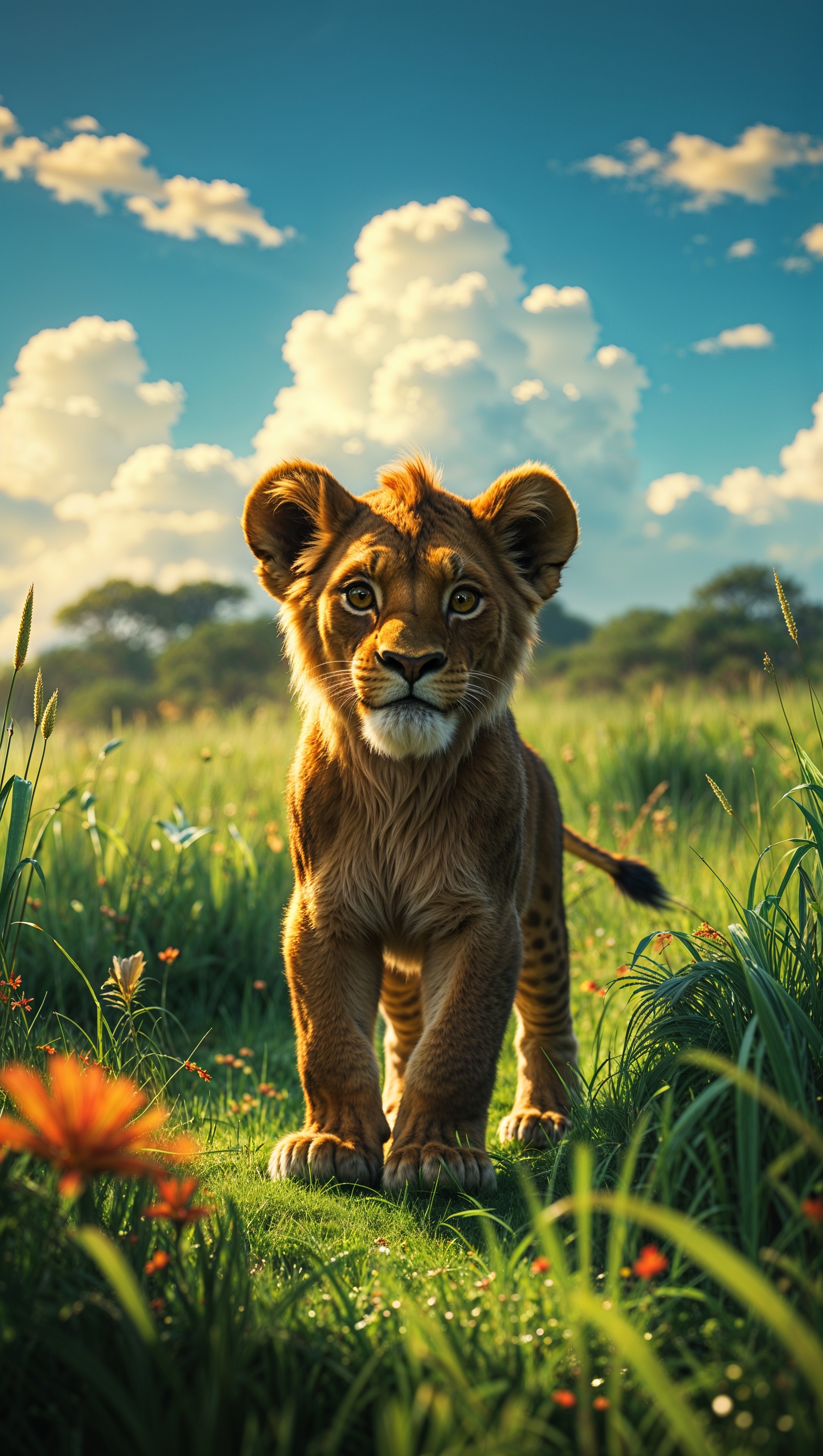 1664x2944 Young Simba in lush green fields, iPhone wallpaper