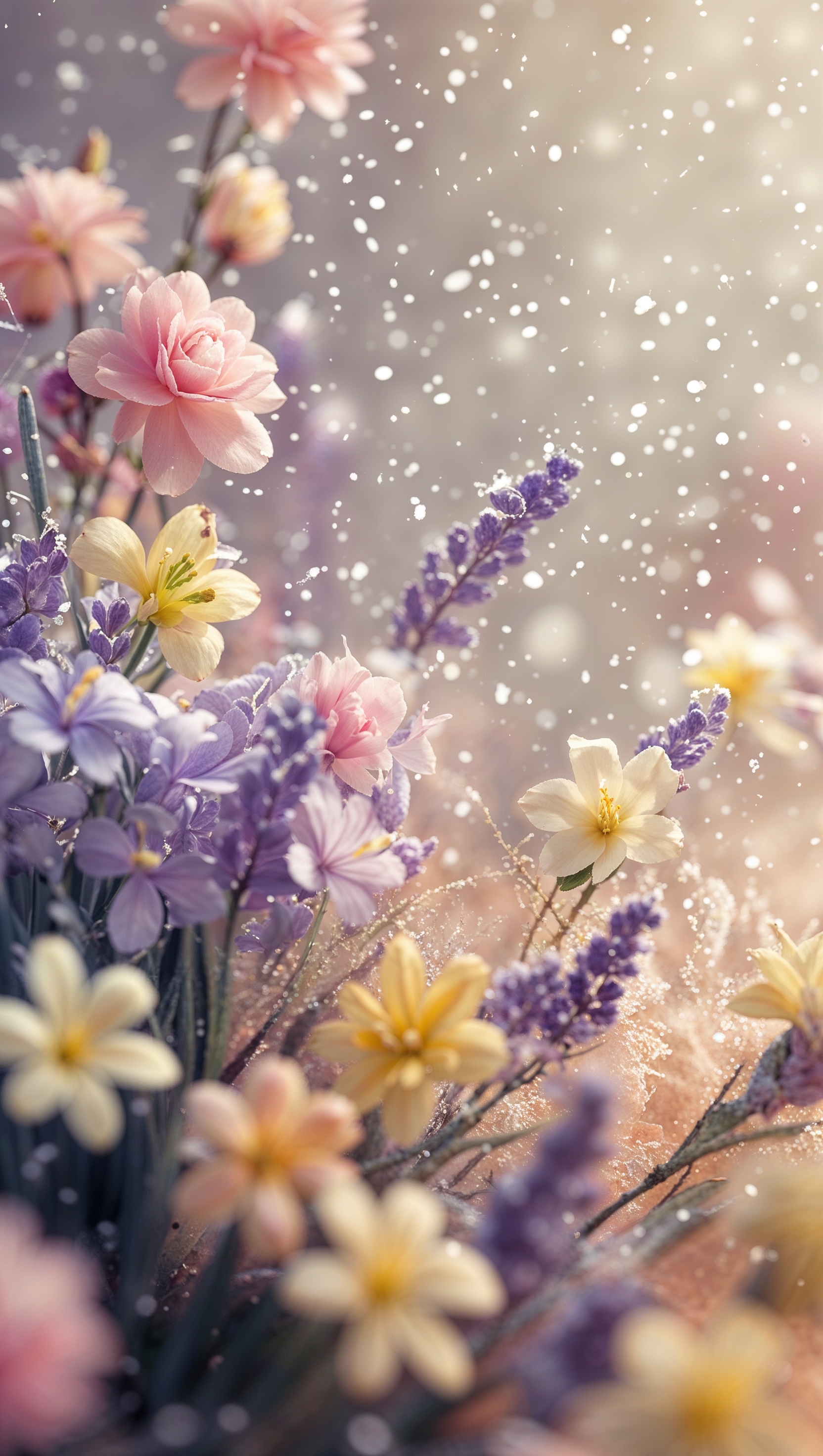 1664x2944 iPhone wallpaper for February with a mix of spring flowers and snow