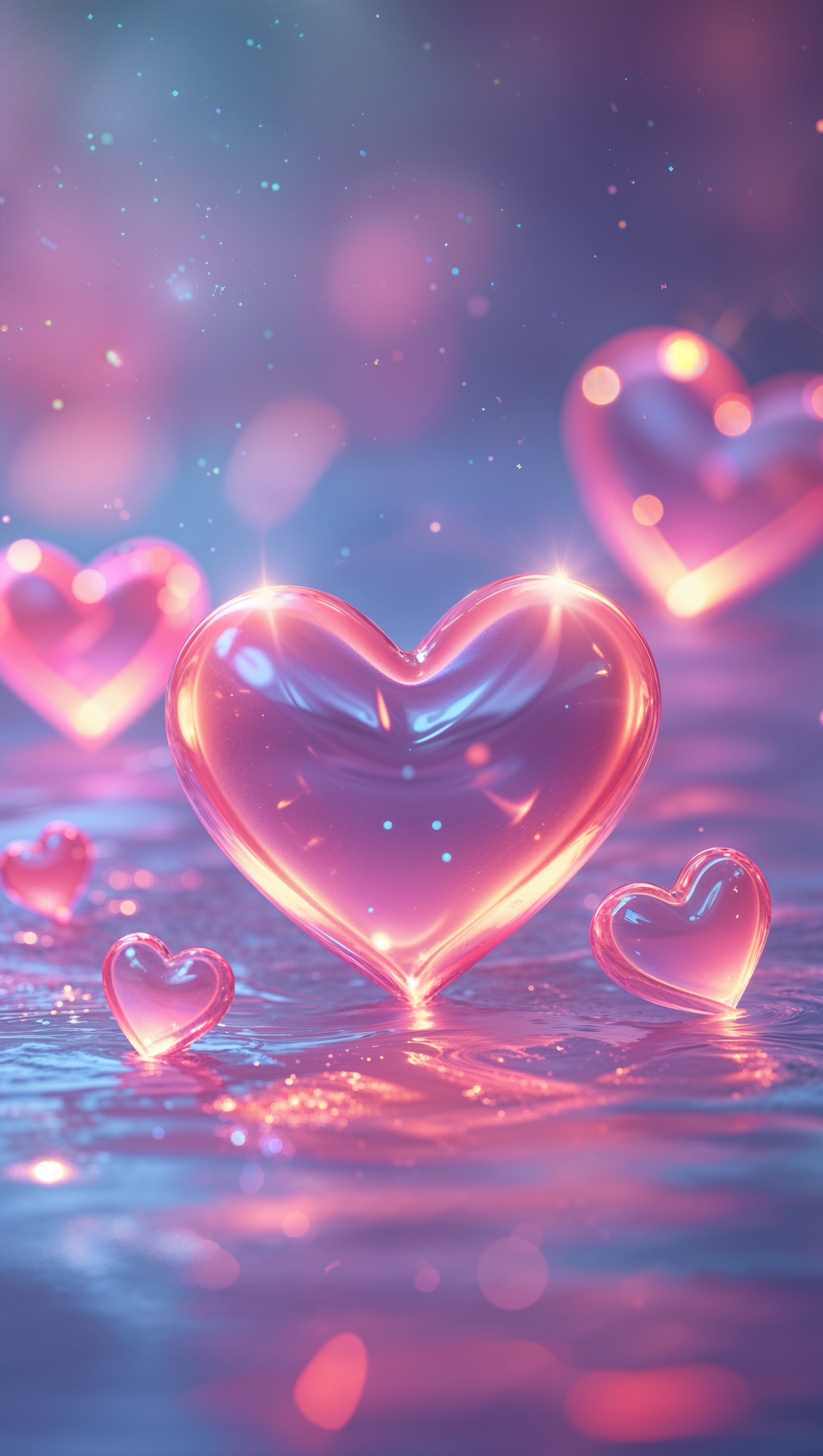 1664x2944 February iPhone wallpaper with crystal hearts and reflected lights