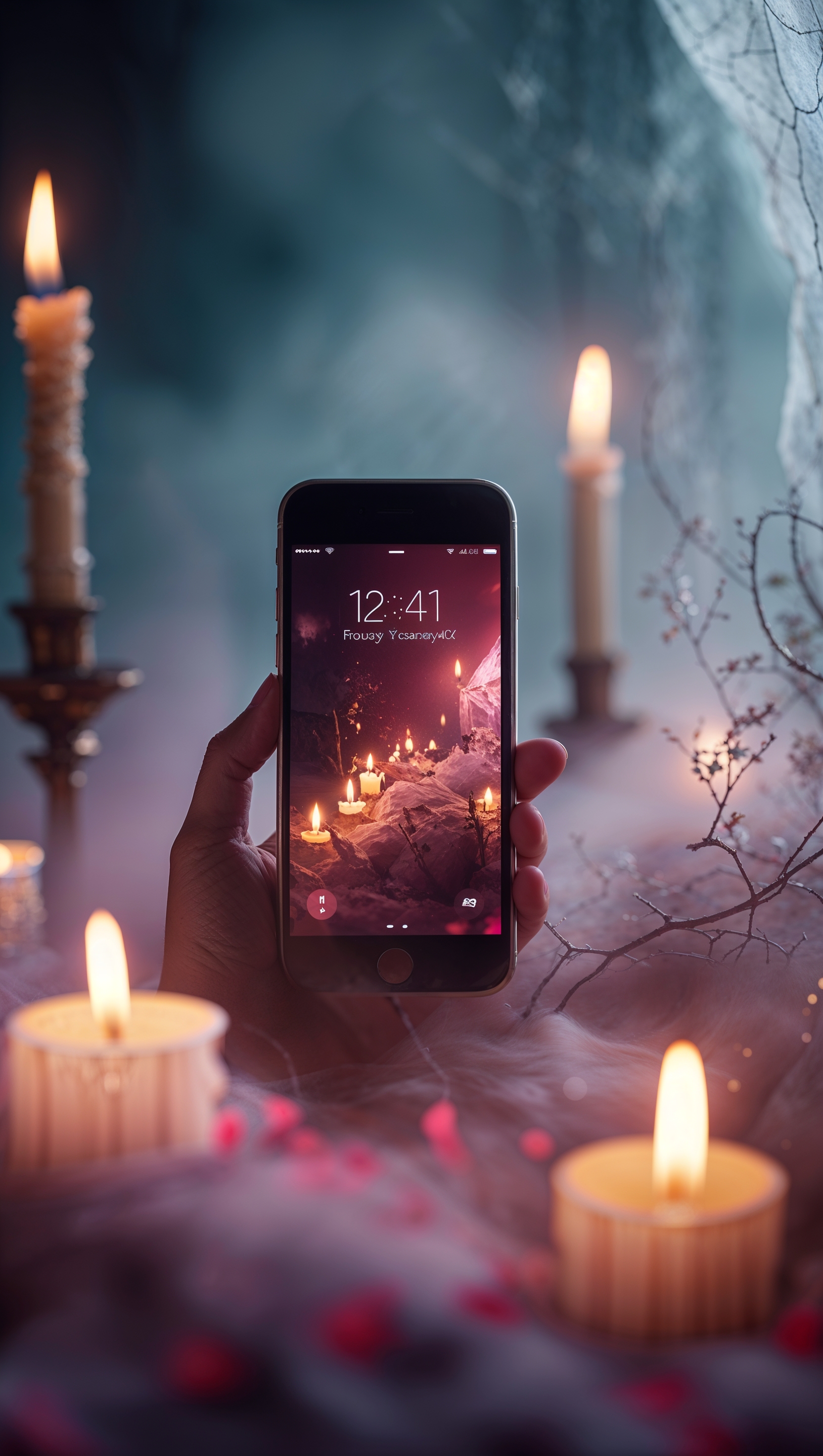 1664x2944 February iPhone wallpaper with a romantic vibe and lit candles