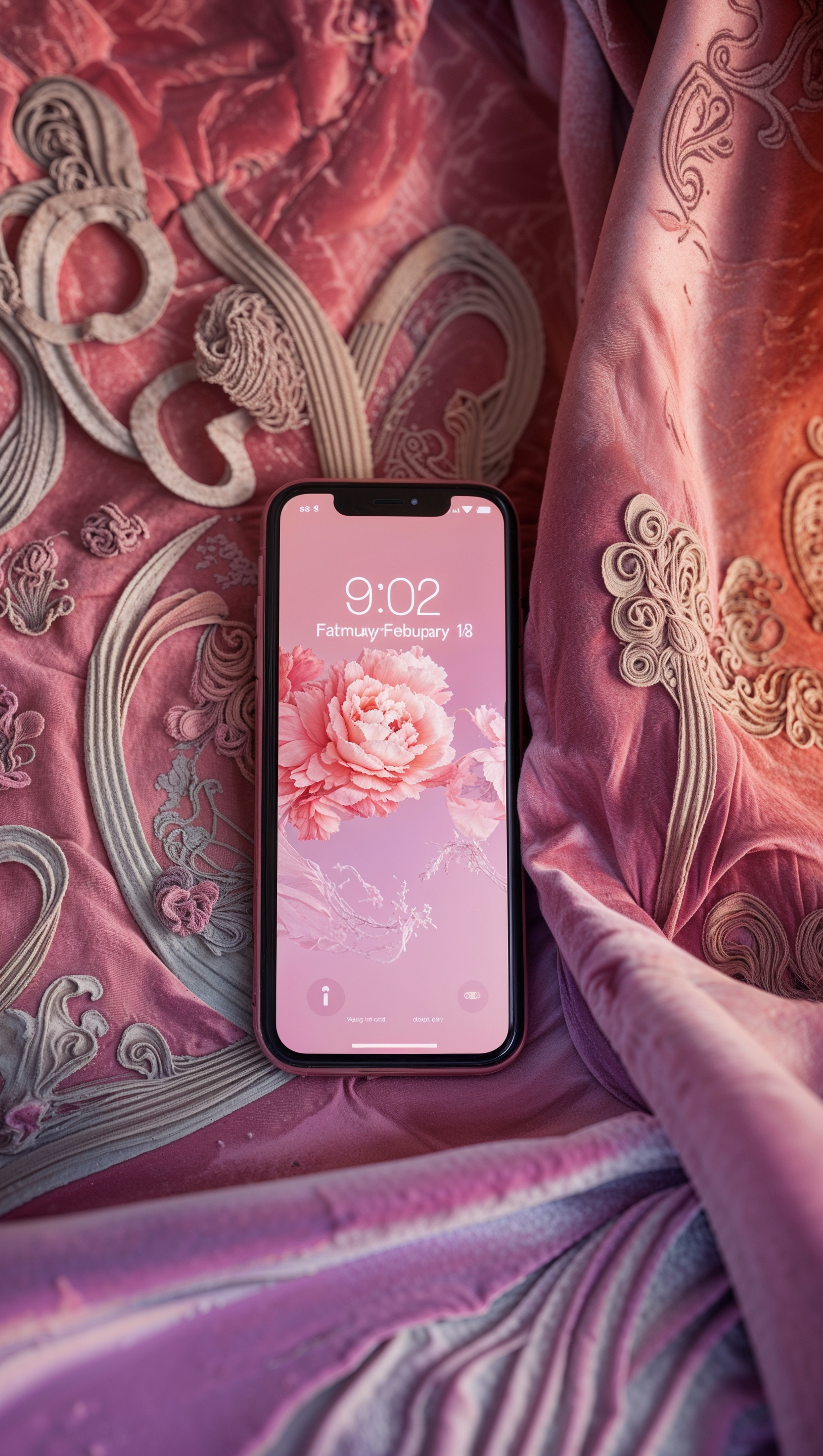 1664x2944 February iPhone wallpaper with a textured fabric background and romantic designs