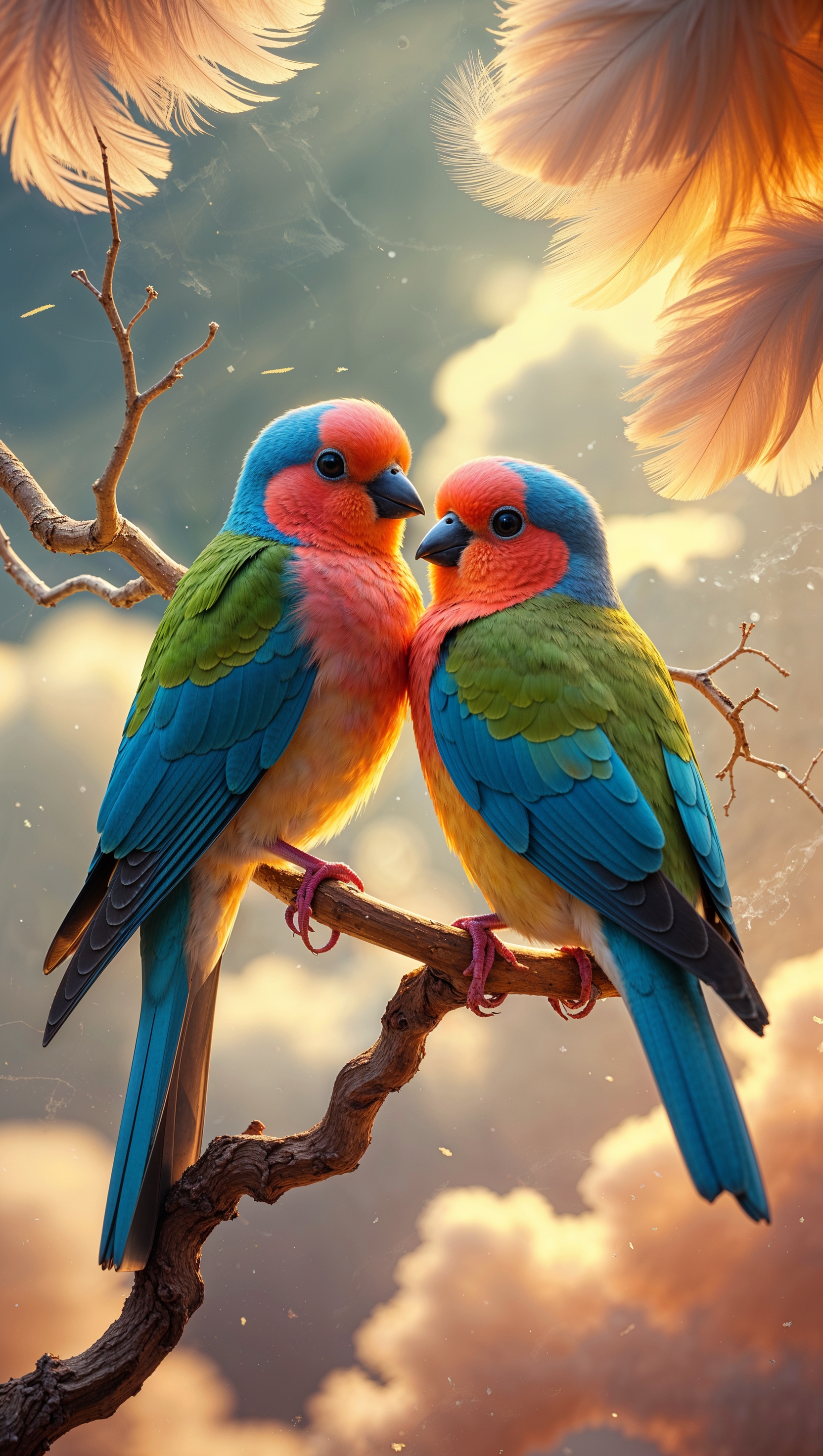 1664x2944 February iPhone wallpaper with a digital painting of two lovebirds