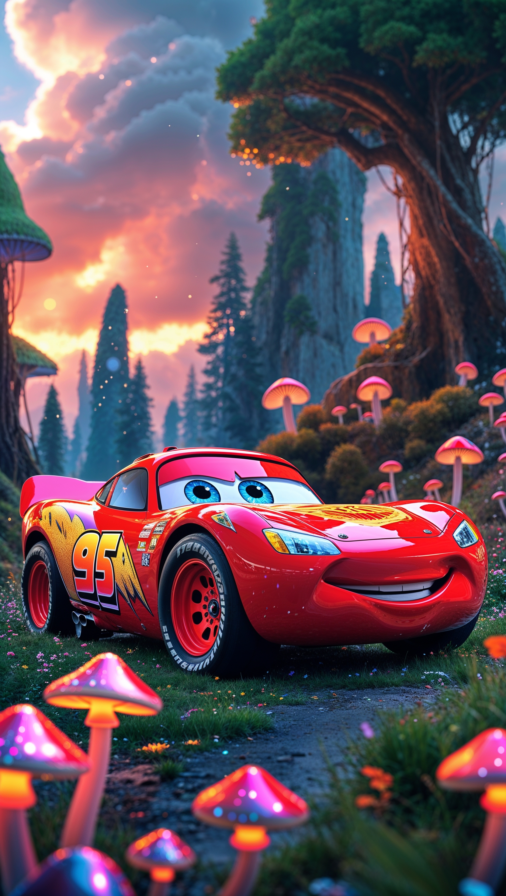1664x2944 A fantasy-style illustration of Lightning McQueen in a magical world for iPhone wallpaper