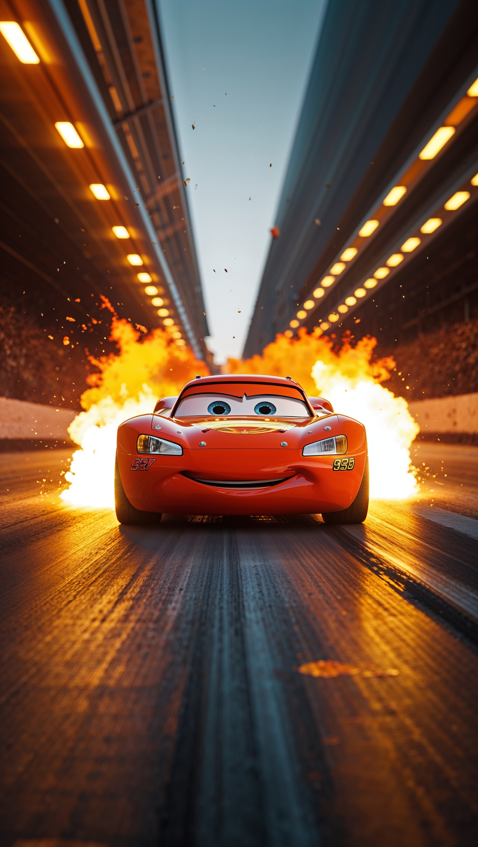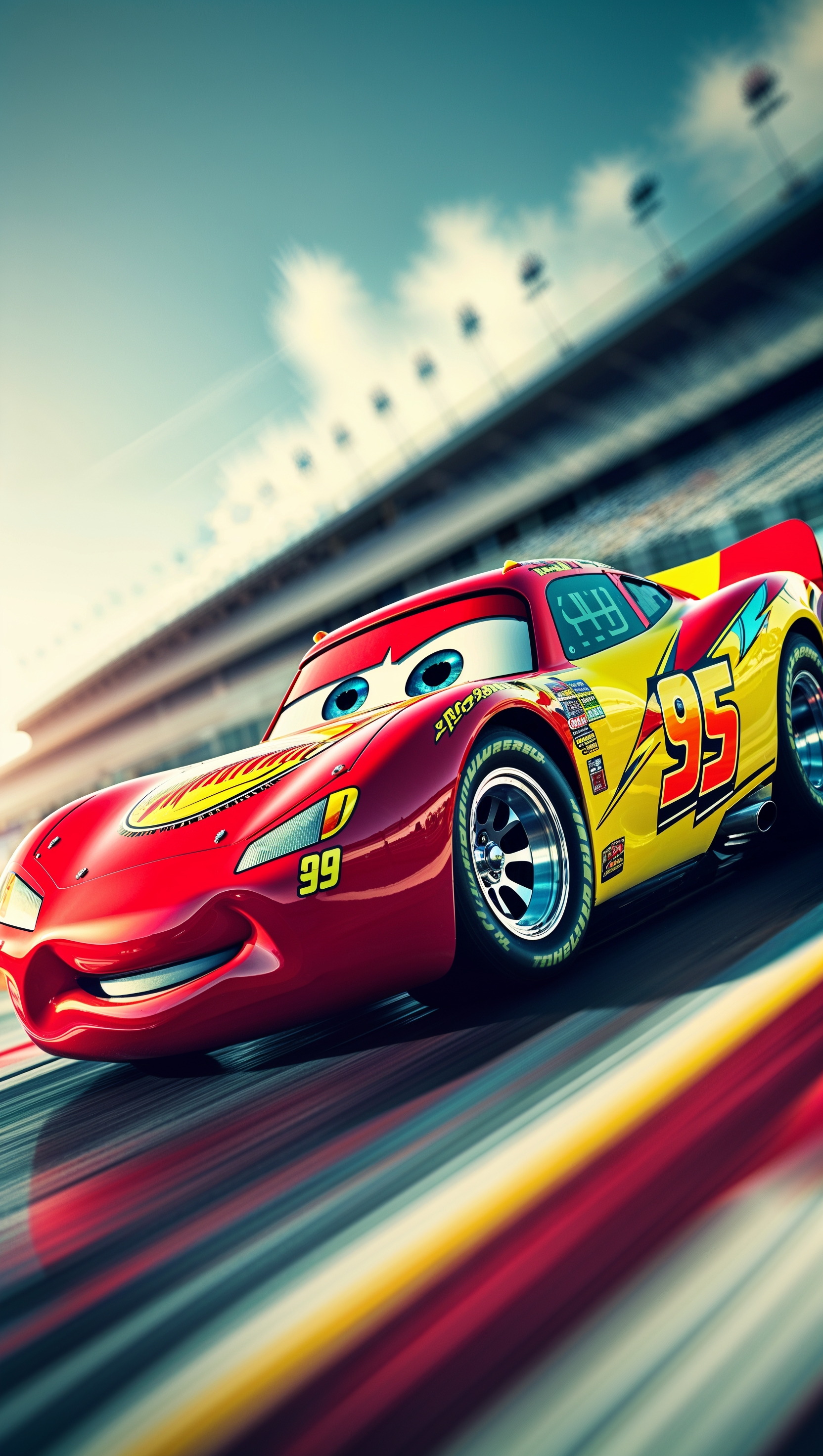 1664x2944 A realistic 3D design of Lightning McQueen in a dynamic background for iPhone wallpaper
