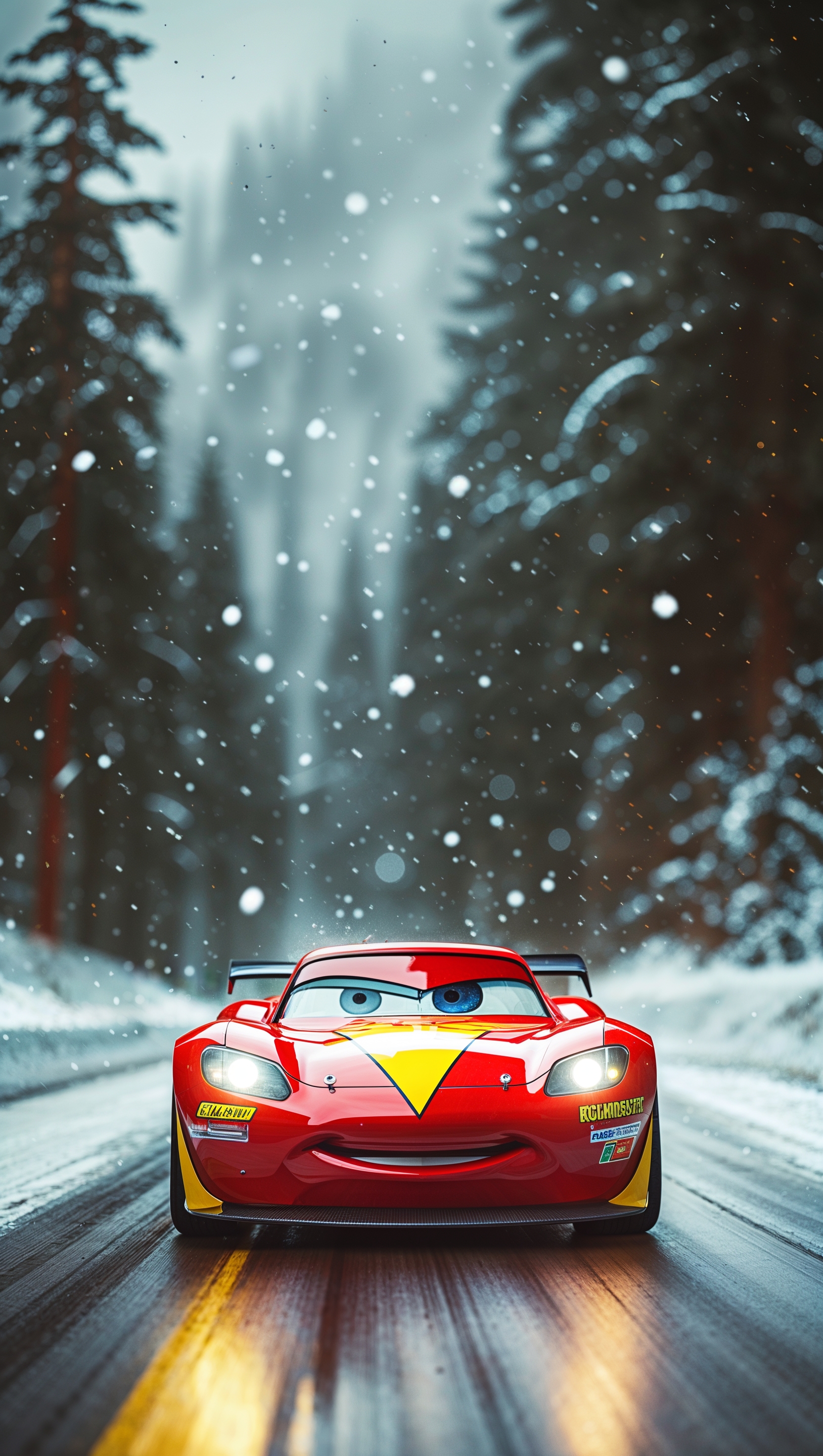 1664x2944 Lightning McQueen on a snowy road with realistic effects for iPhone wallpaper