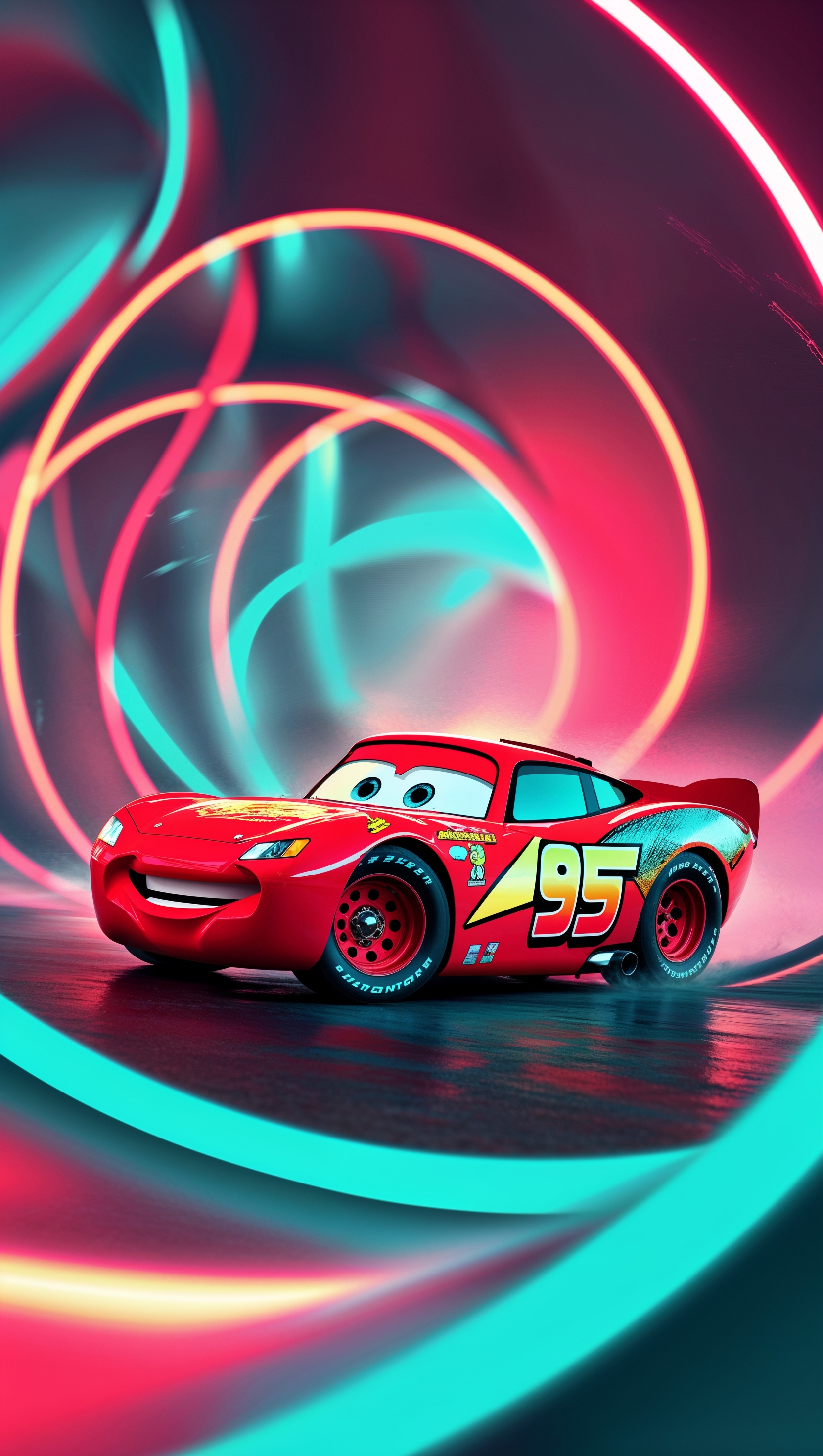 1664x2944 Lightning McQueen with a neon design at night, perfect for iPhone wallpaper