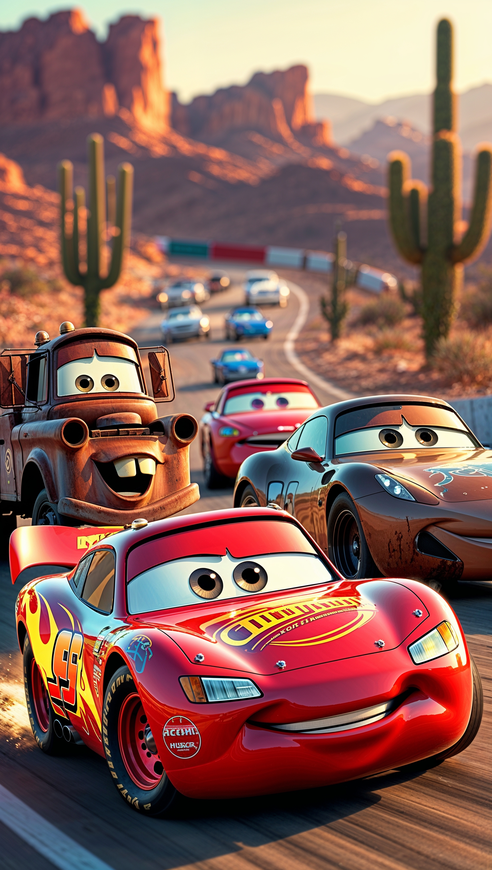 1664x2944 Lightning McQueen in the desert with a sunset, ideal for iPhone wallpaper
