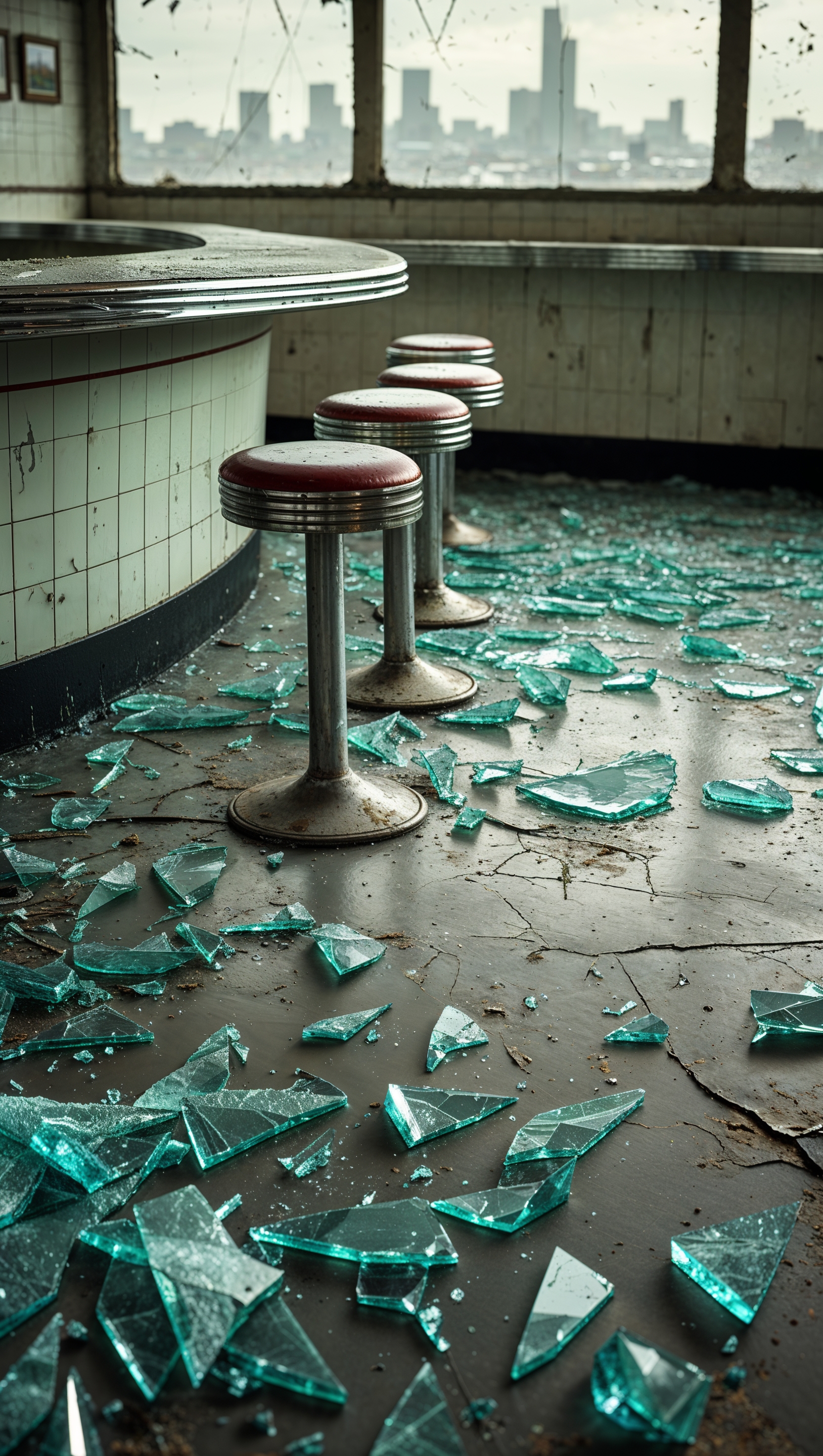 1664x2944 Shattered glass shards covering the floor of a ruined diner