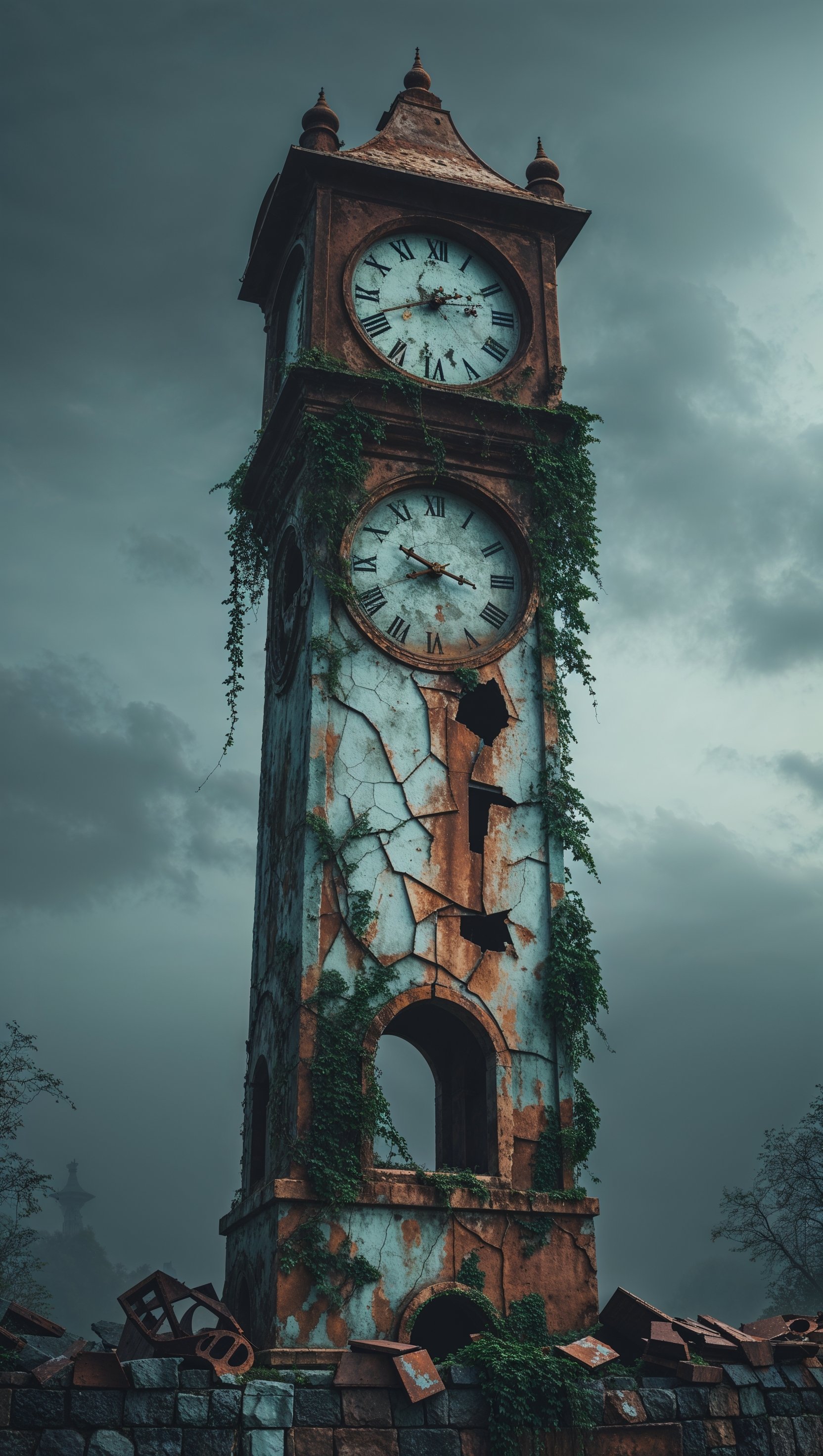 1664x2944 Rusted clock tower with broken hands, frozen in time