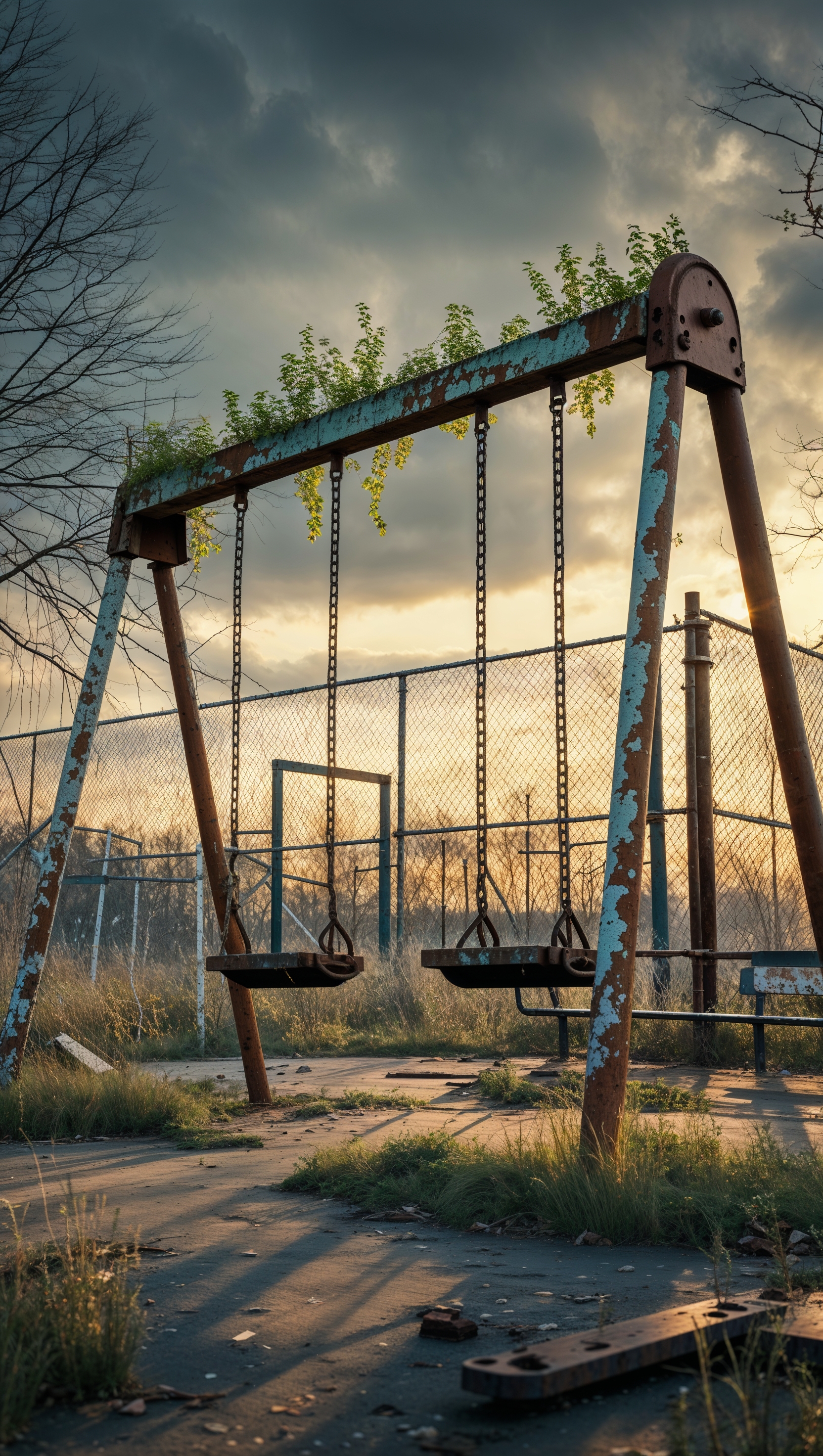1664x2944 A rusted swing set moving slightly in the wind, abandoned playground