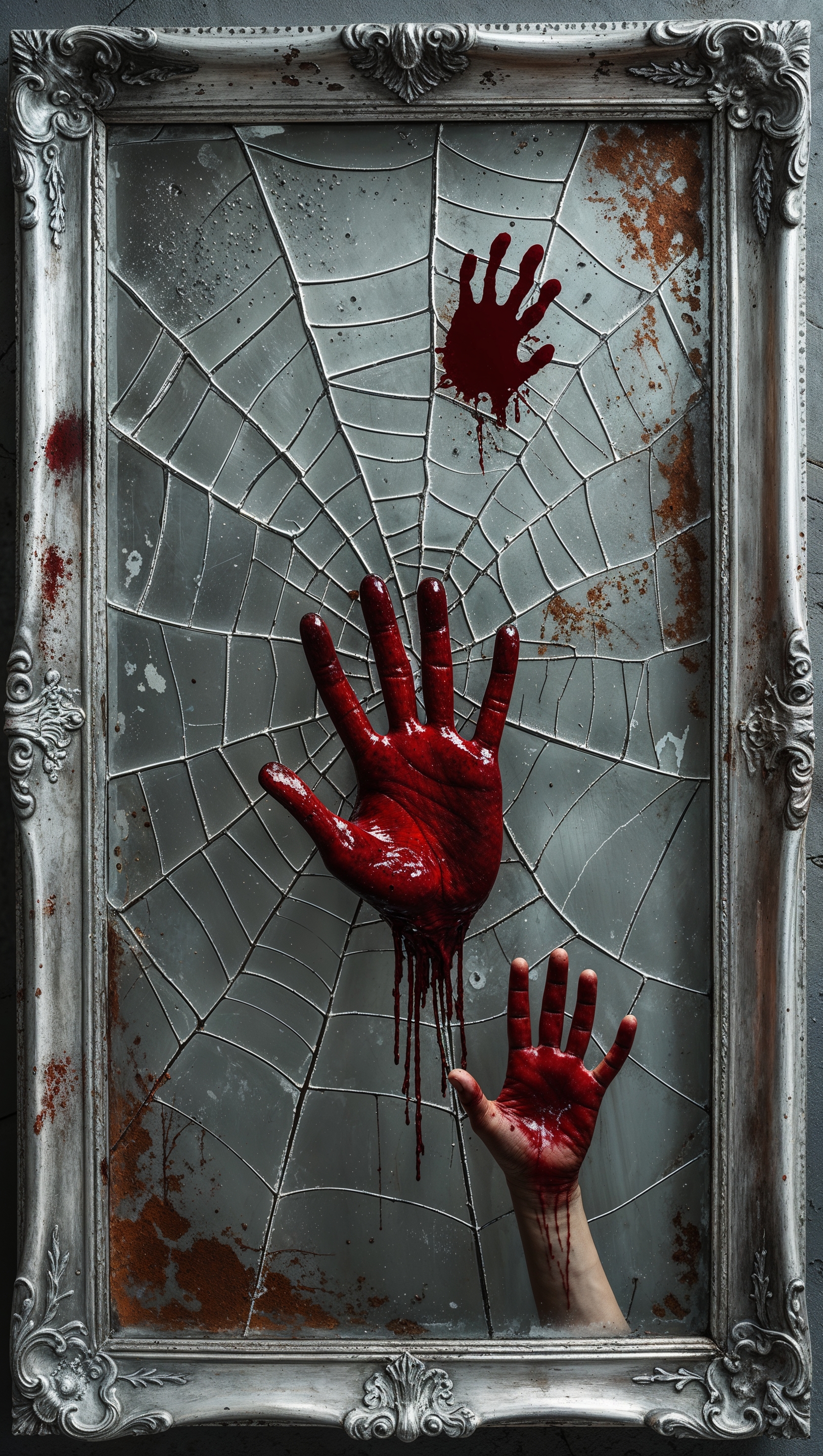 1664x2944 Bloodied handprints on a cracked and dirty mirror