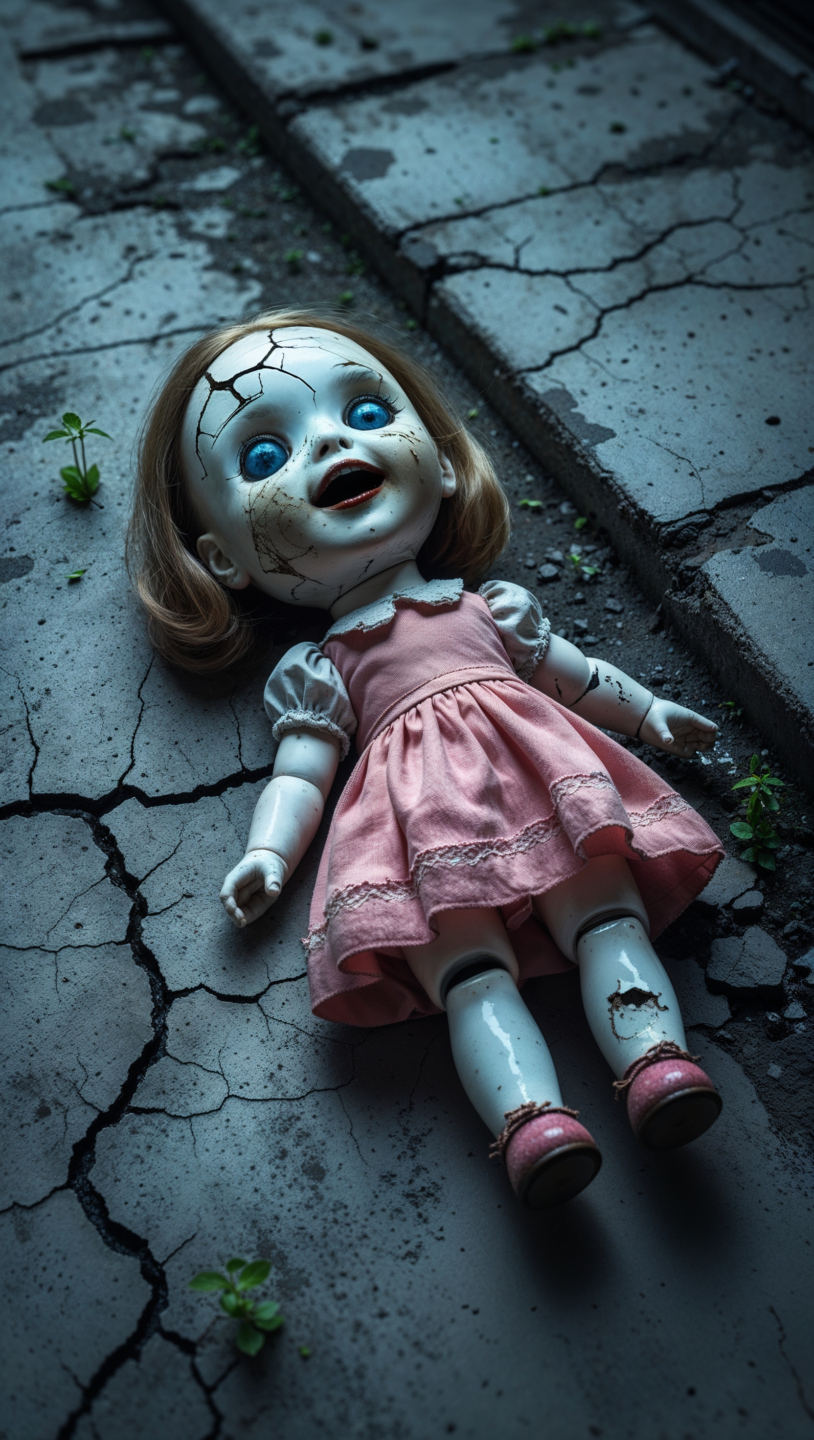 1664x2944 A broken doll lying on a cracked sidewalk, unsettling mood