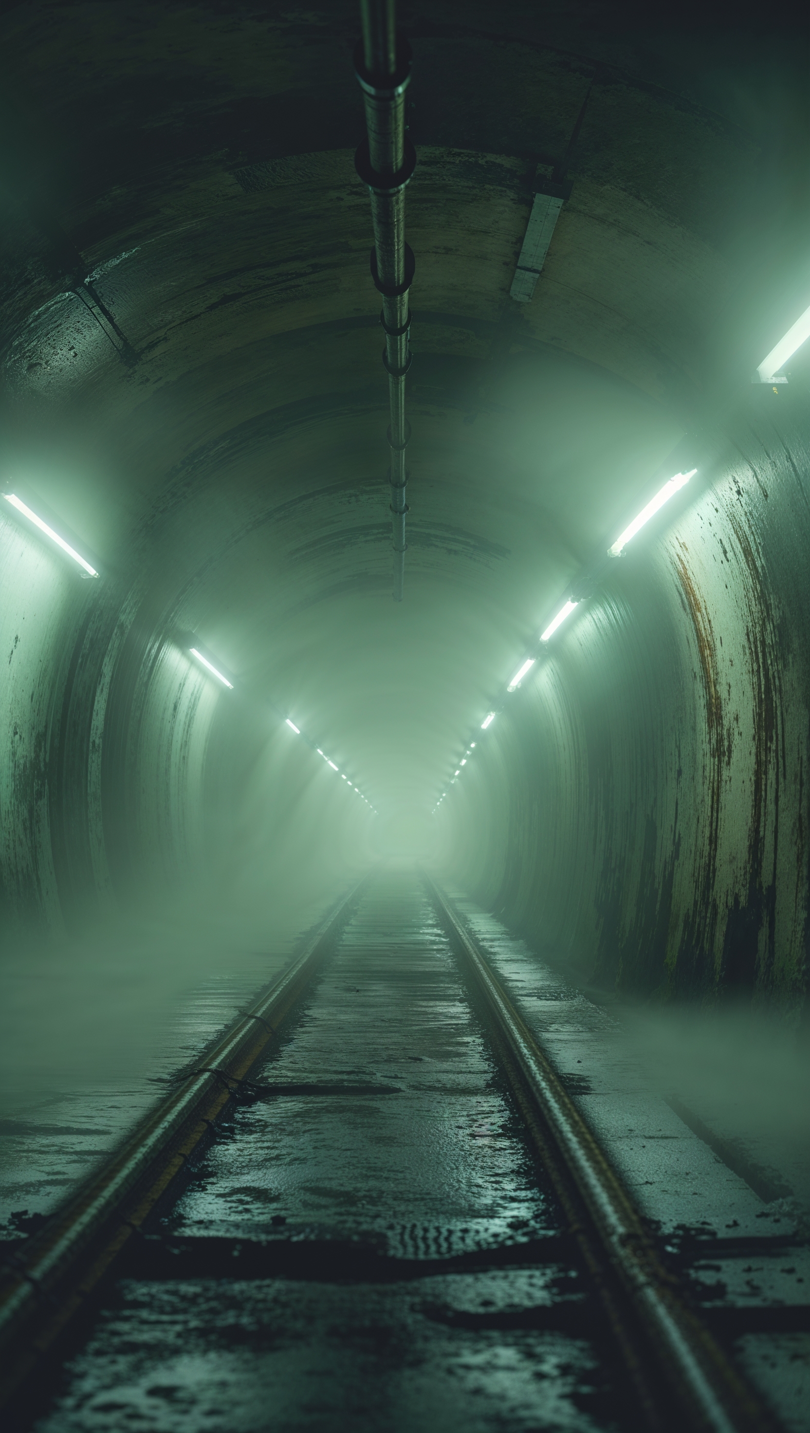 1664x2944 Underground subway tunnel filled with fog and dim lighting