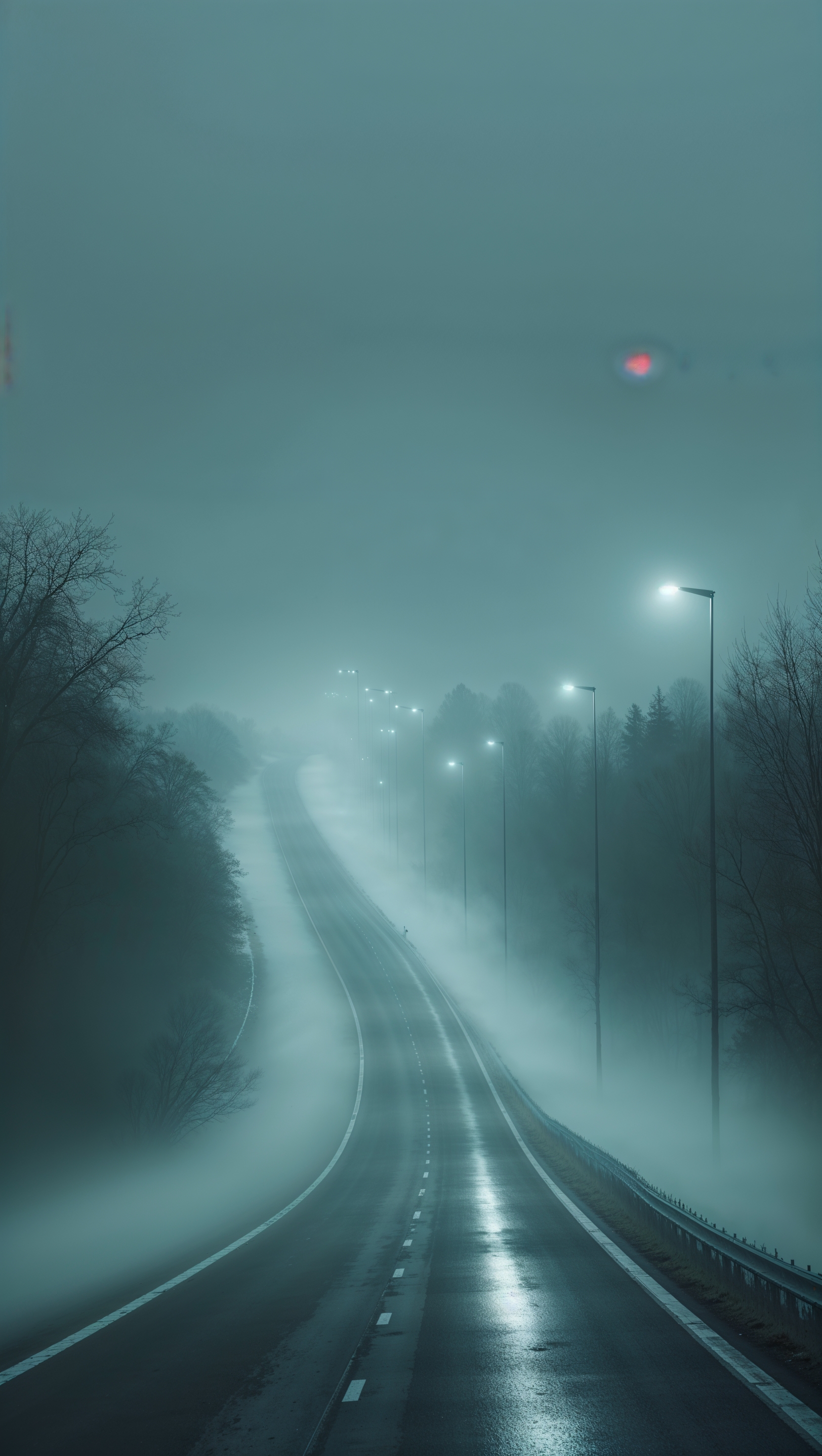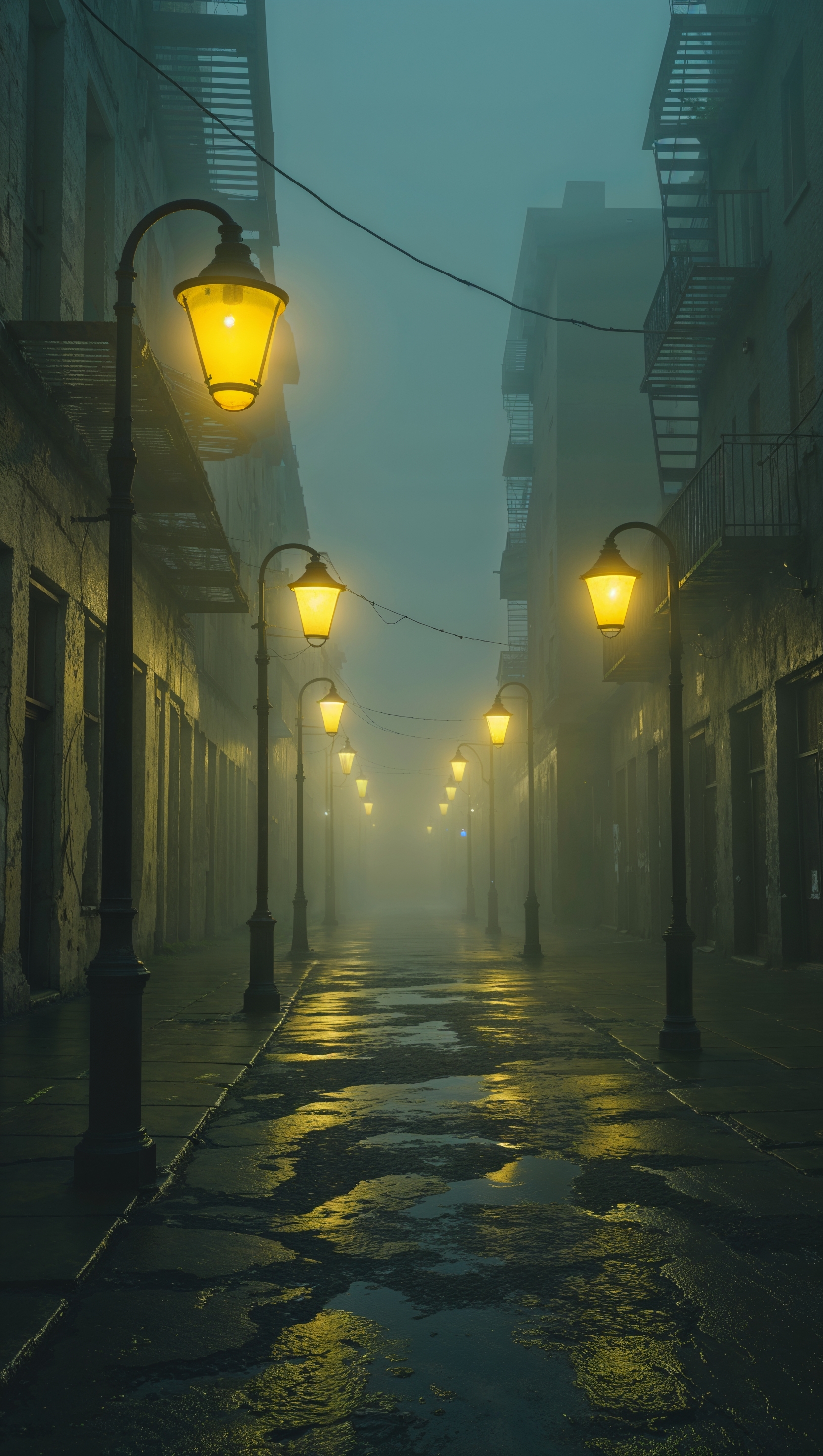 1664x2944 Fog-covered street with broken streetlights, eerie atmosphere