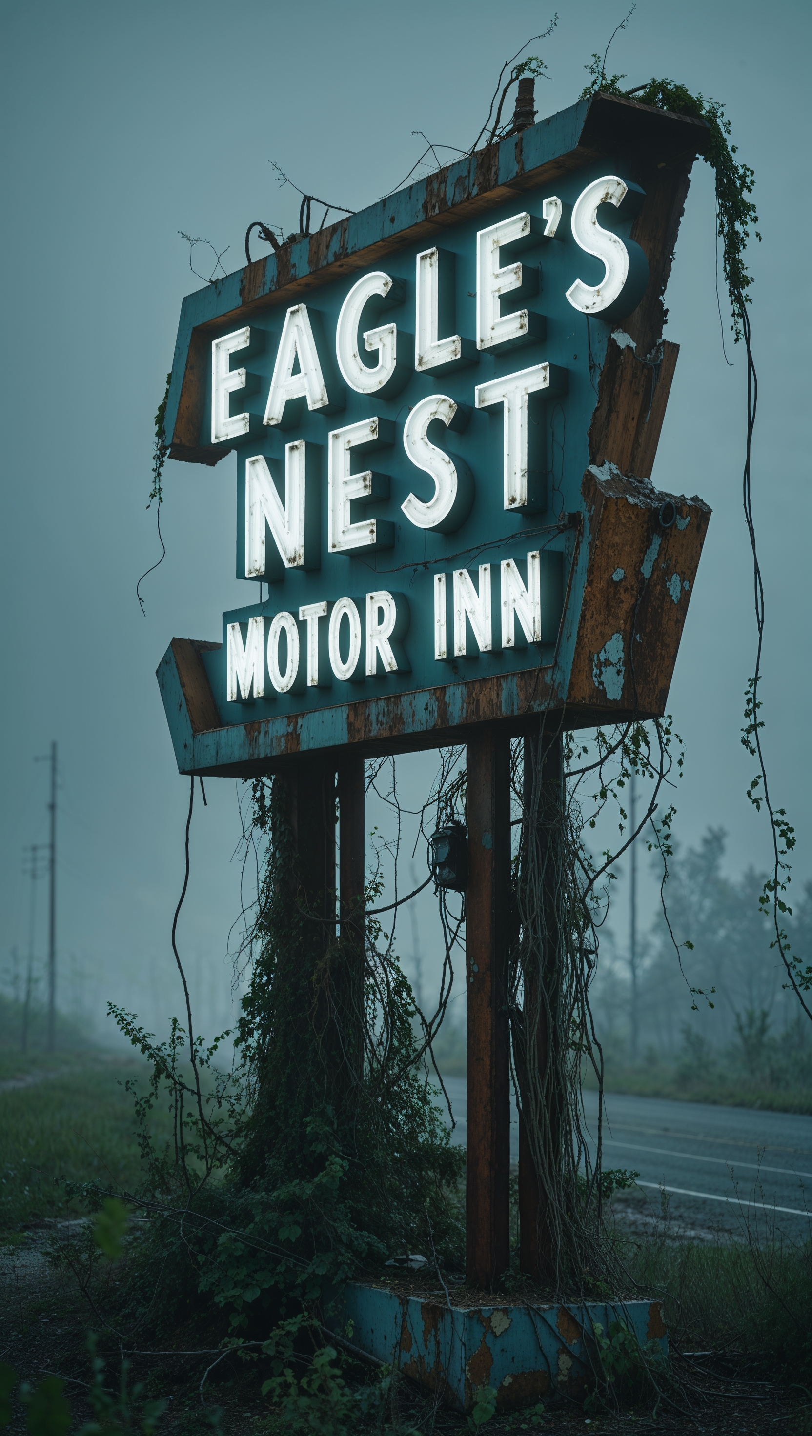 1664x2944 Old, decayed motel sign barely visible through the fog
