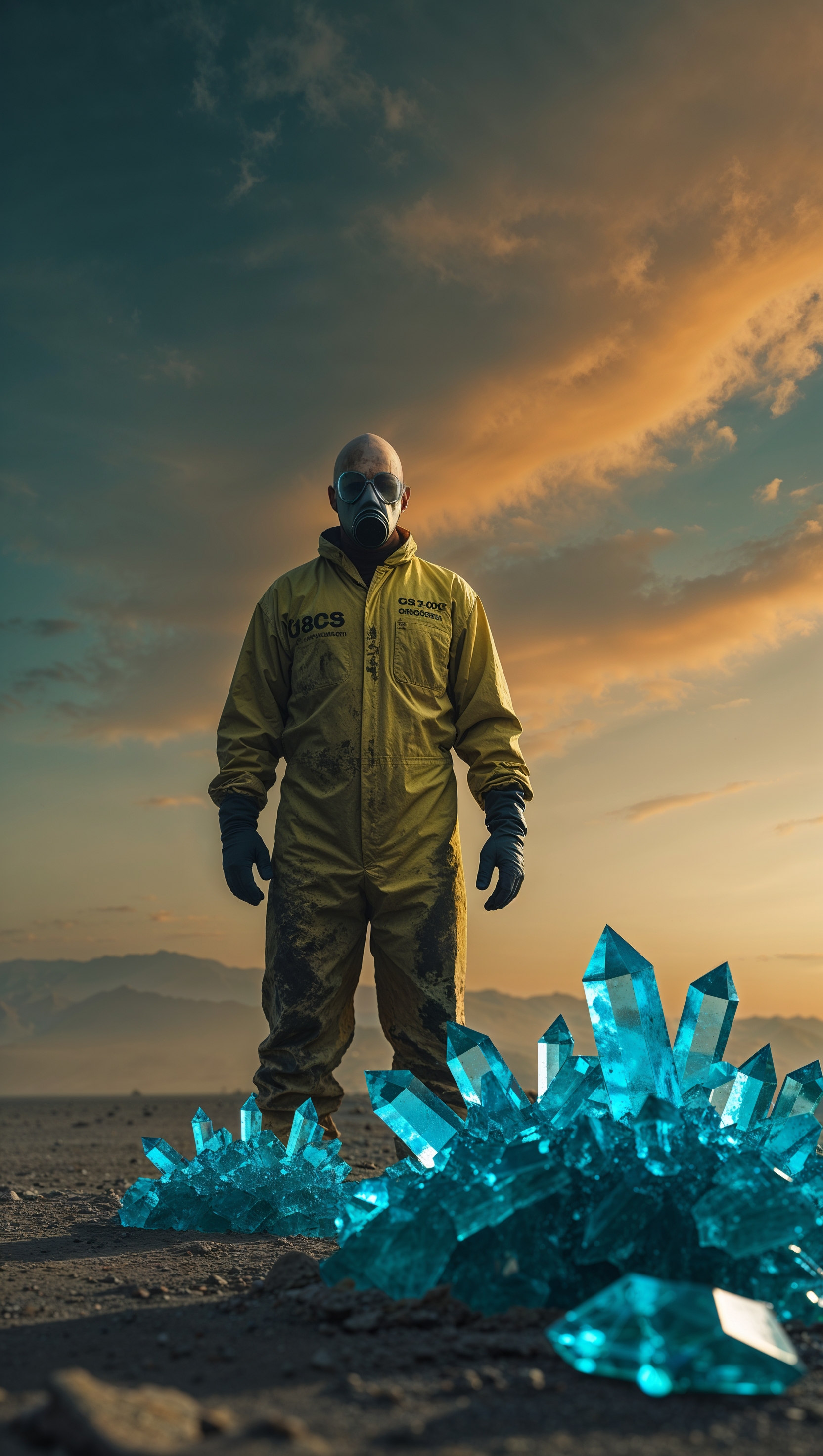 1664x2944 Create an iPhone wallpaper with a Breaking Bad theme, featuring elements like blue crystals (methamphetamine), a dusty sky, and a silhouette of Walter White in a hazmat suit