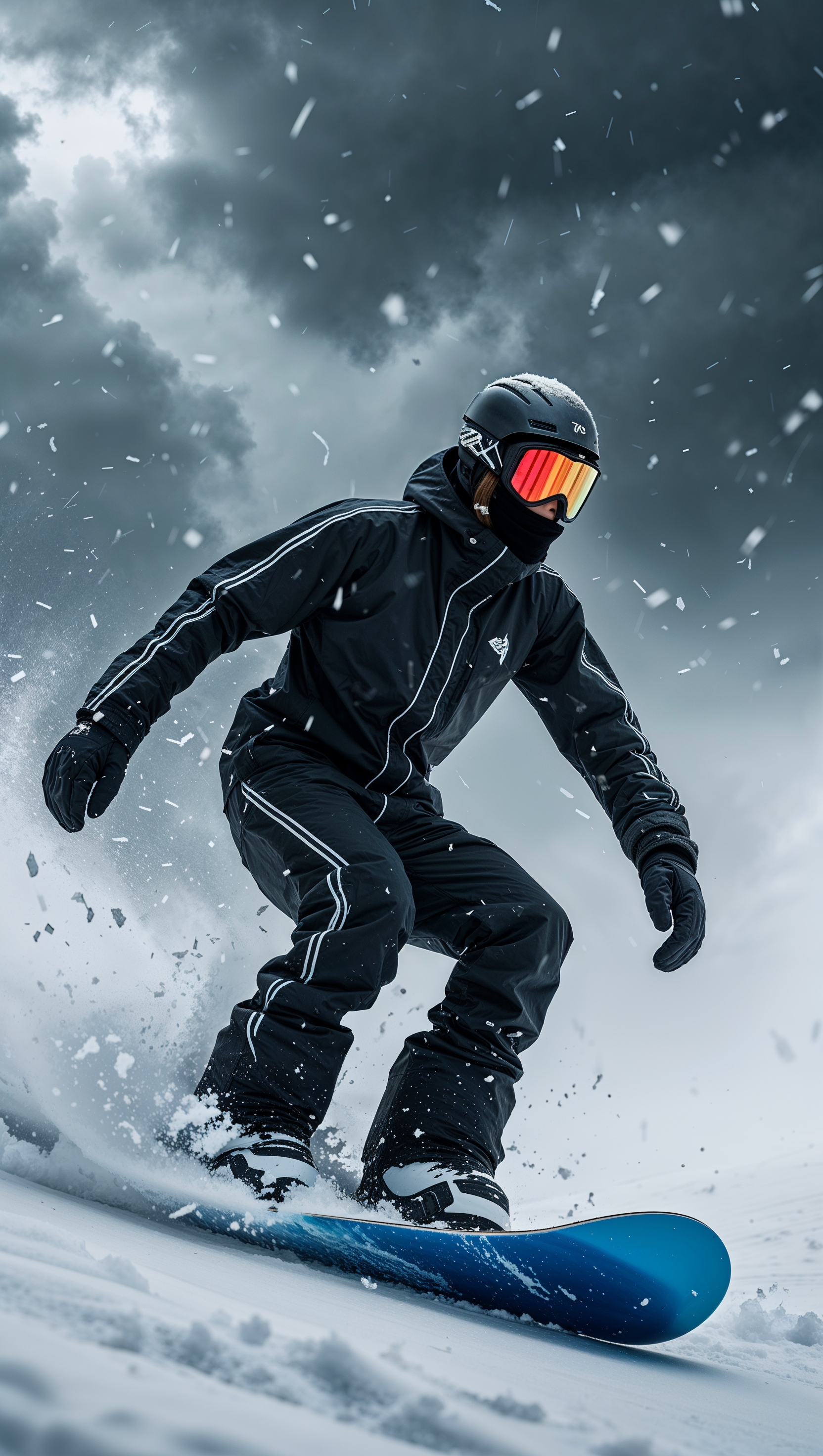 1664x2944 Snowboarder riding through a snowstorm, dramatic contrast and mood