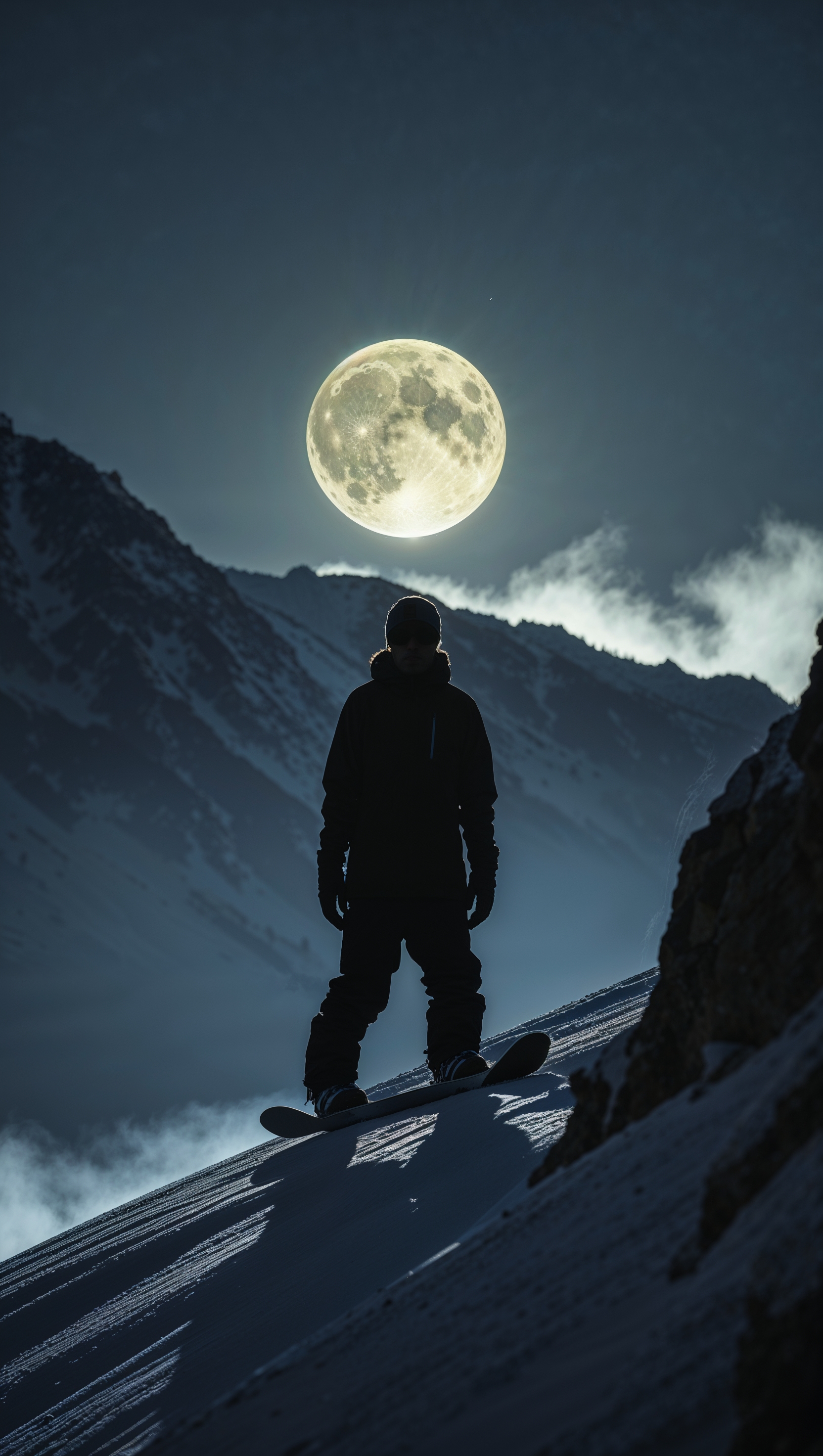 1664x2944 Silhouette of snowboarder on a ridge with full moon above, moody vibe