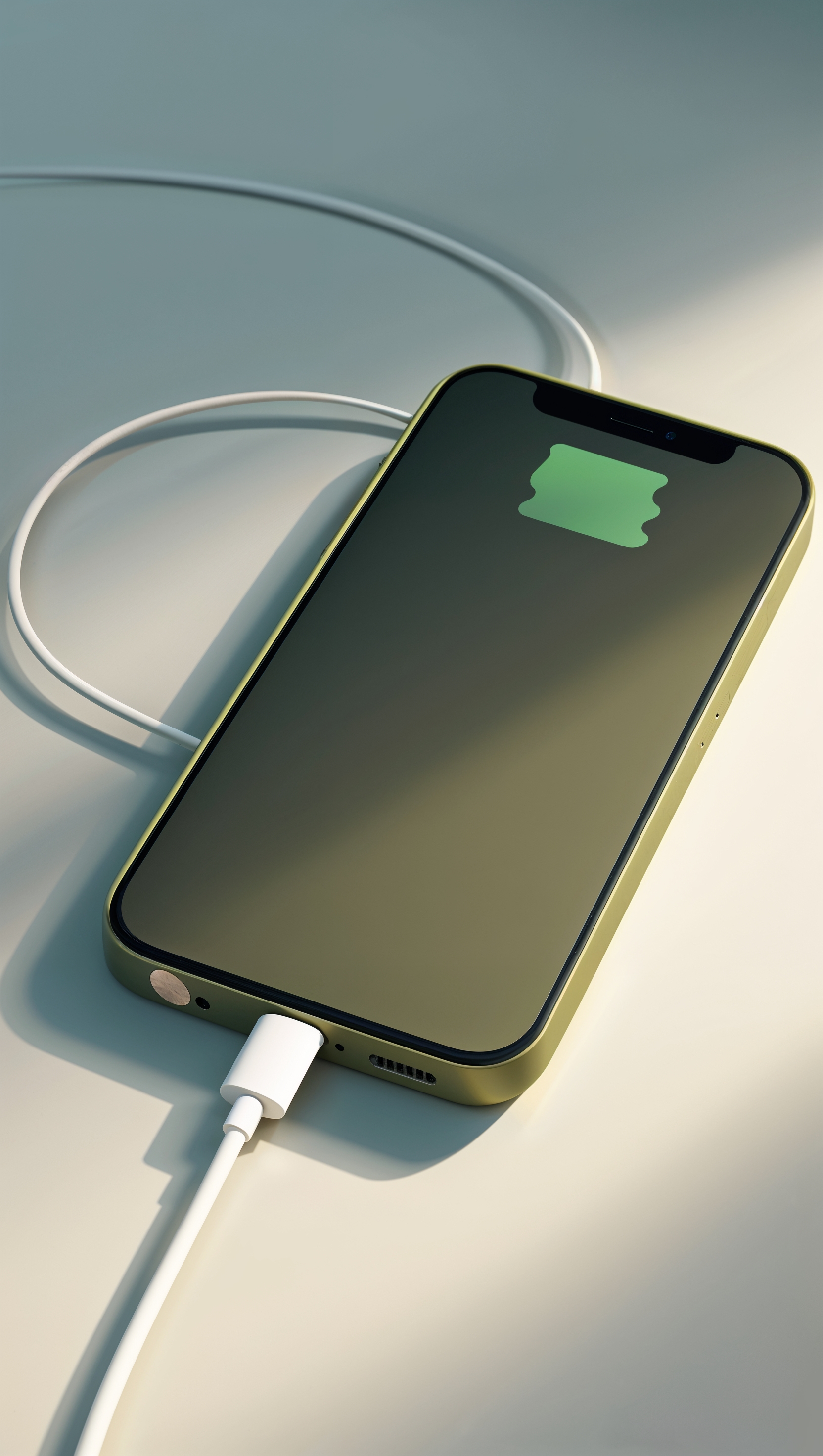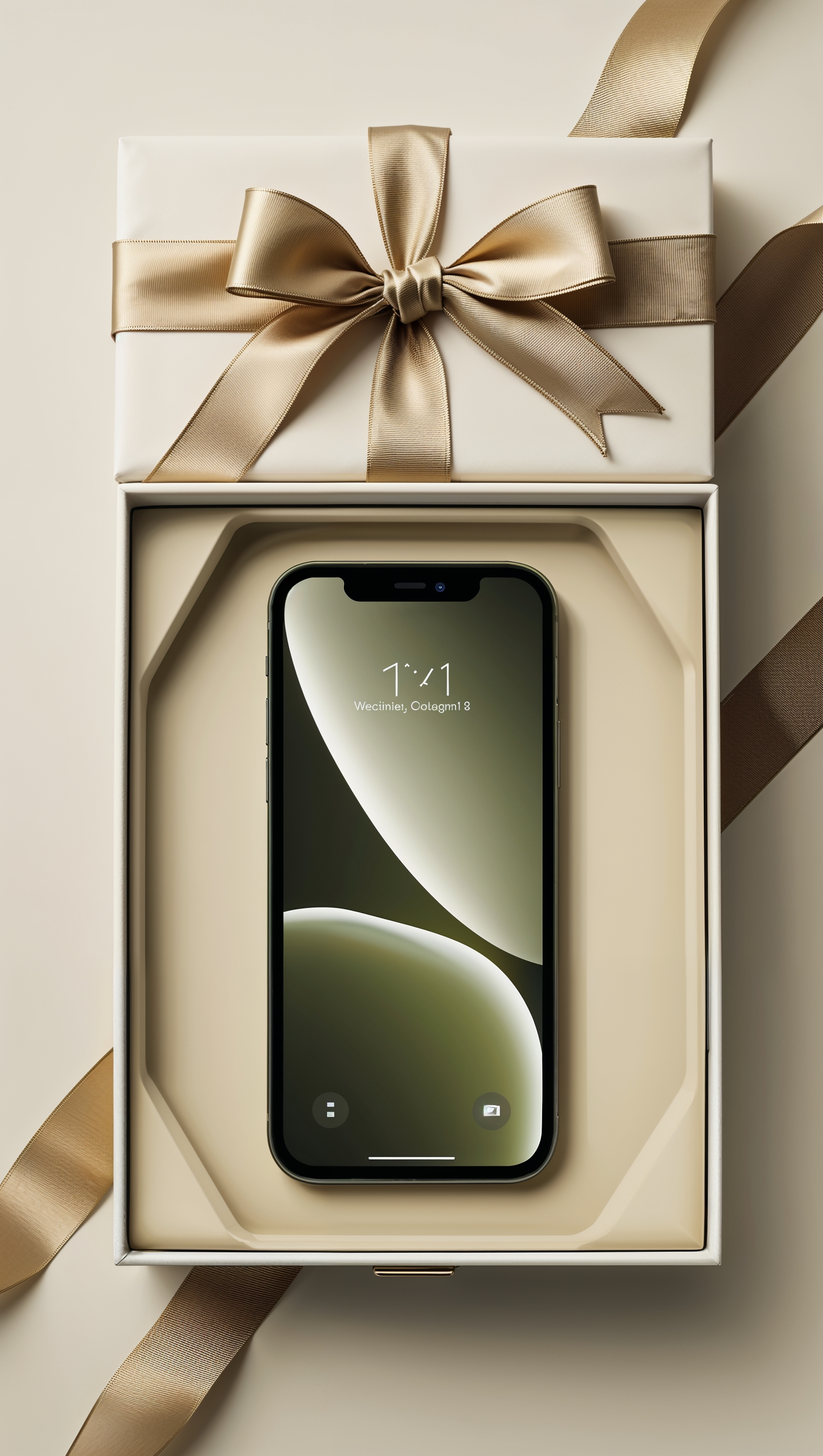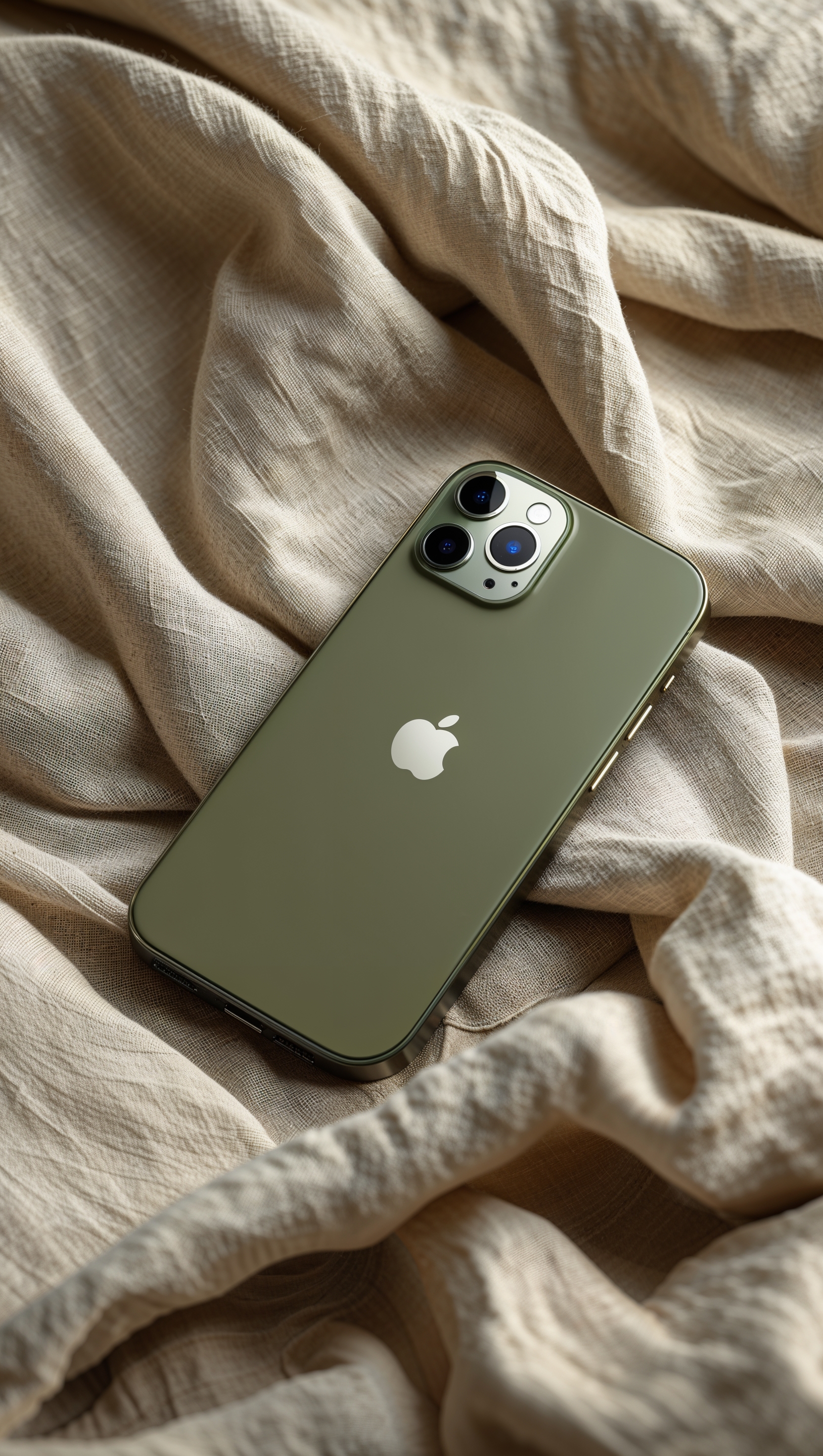 1664x2944 Olive green iPhone in a top-down view on a bed