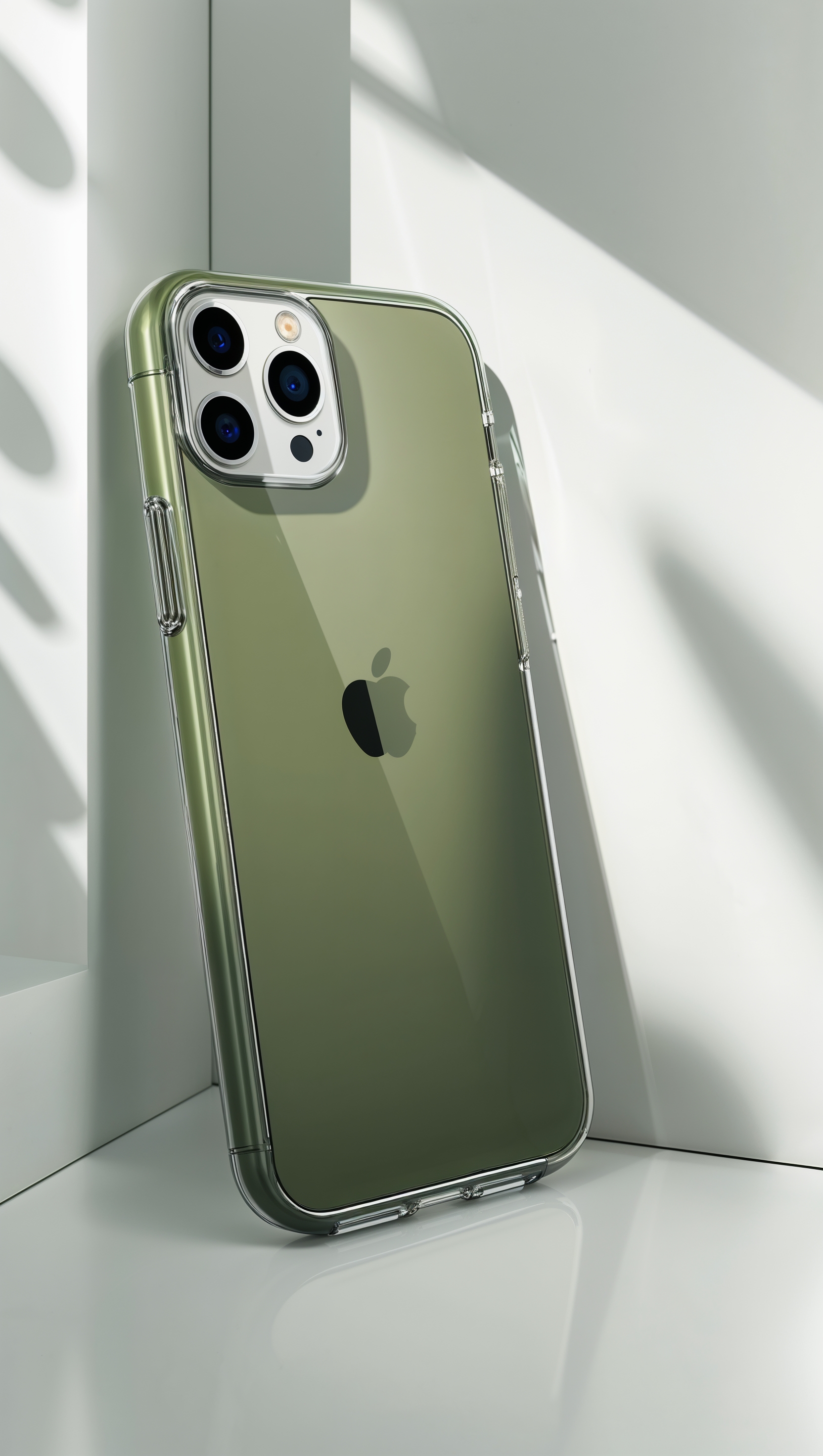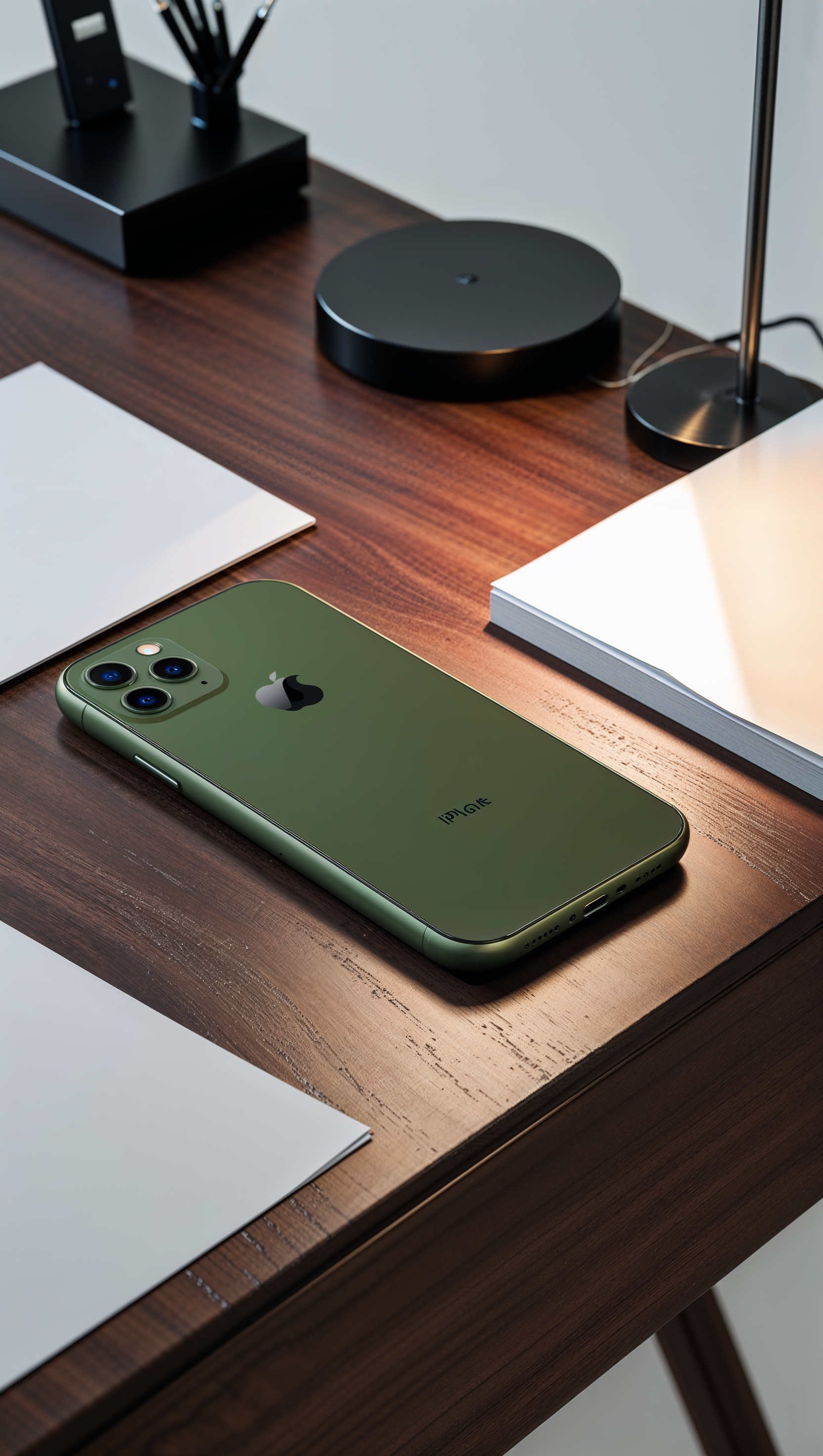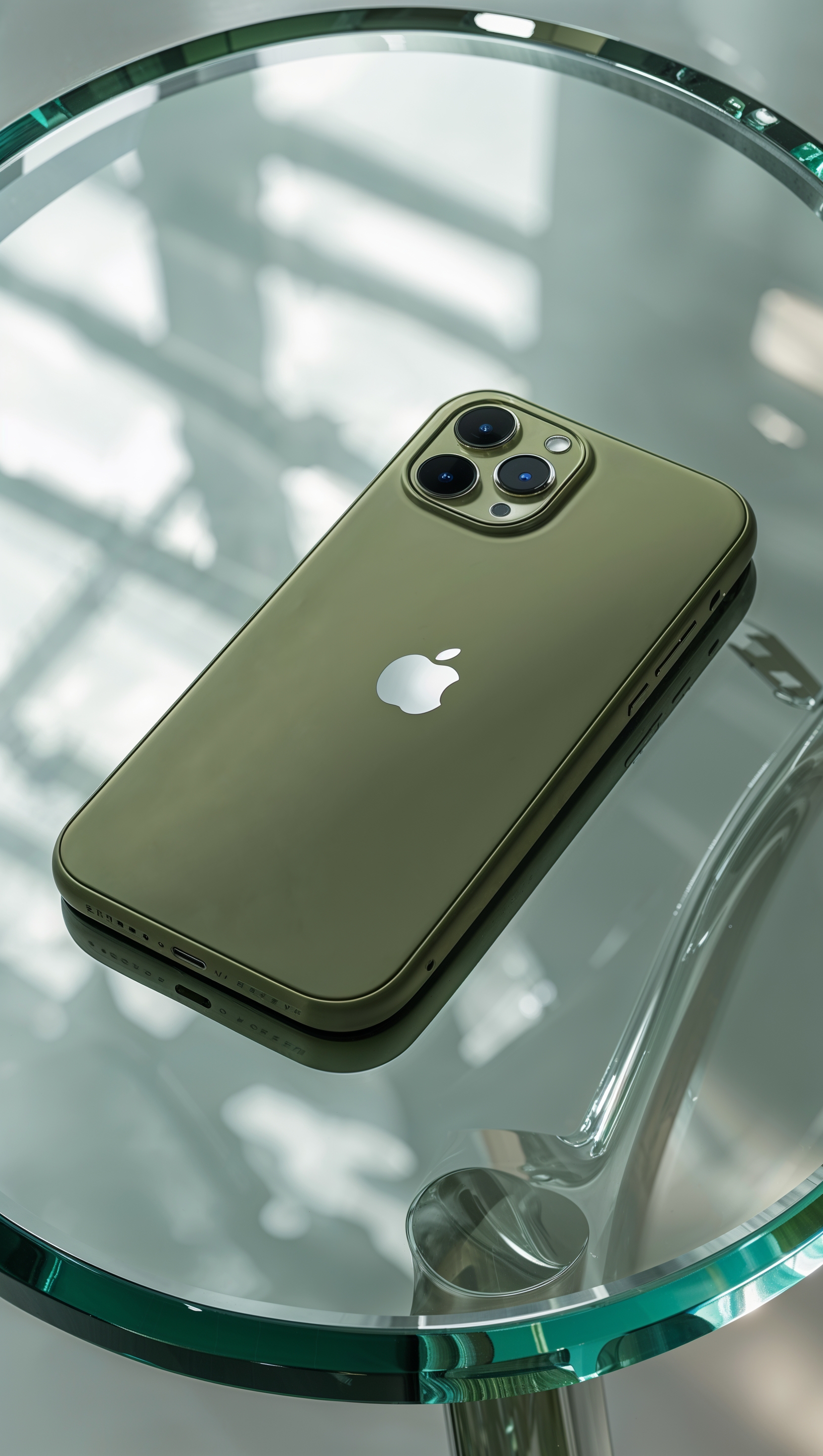 1664x2944 Olive green iPhone on a metal tray with accessories