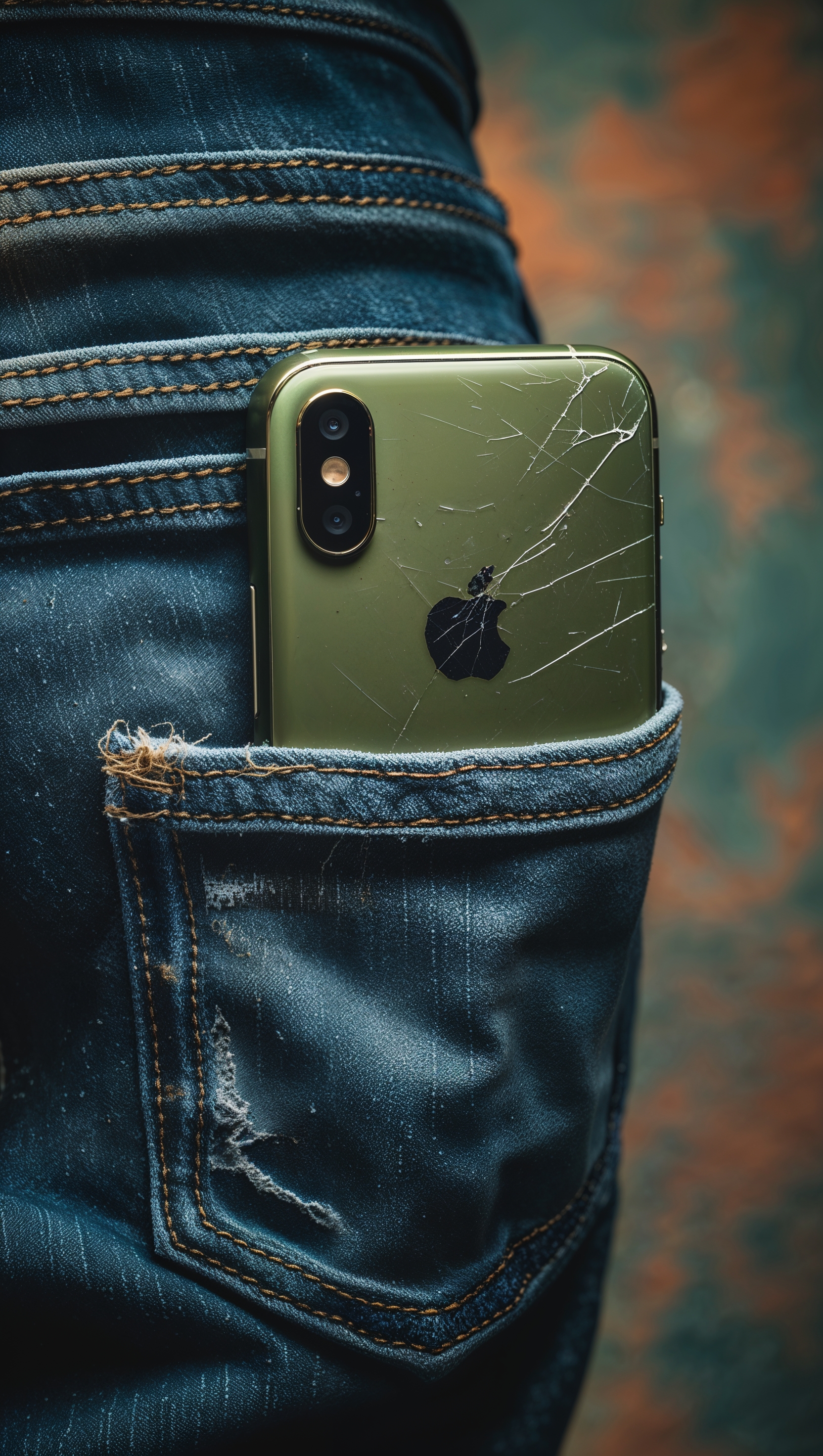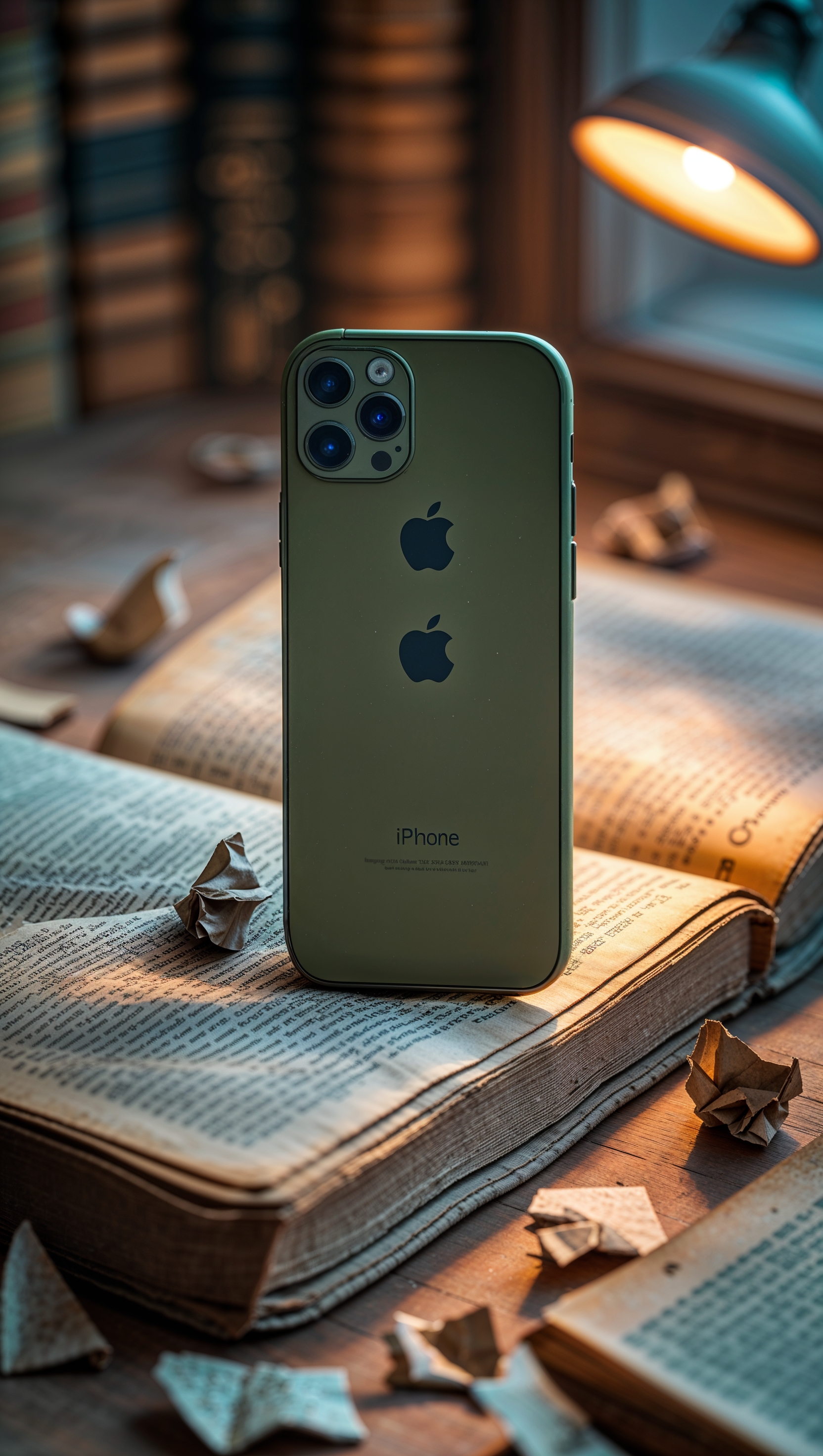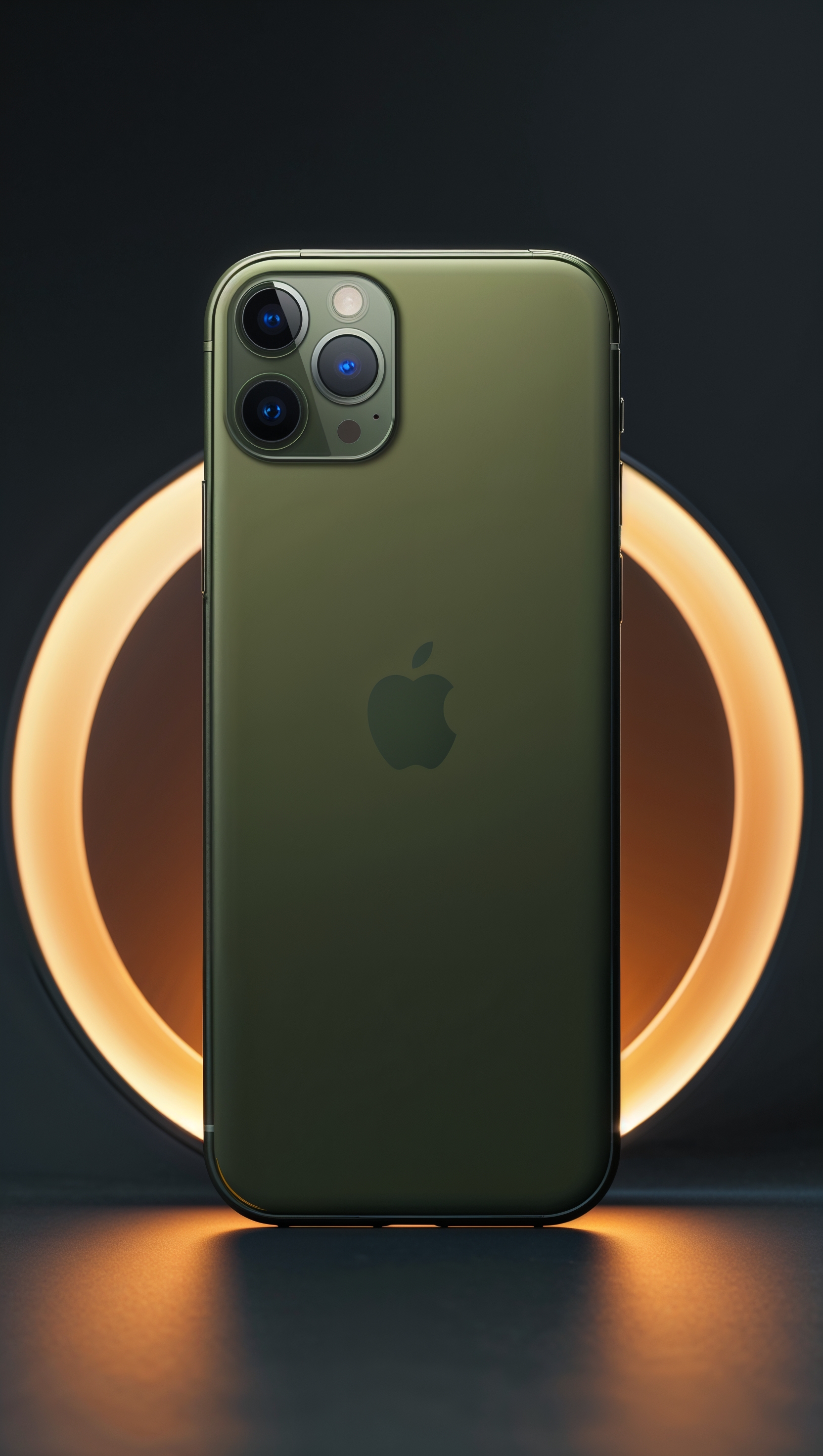 1664x2944 Olive green iPhone on a metal tray with accessories