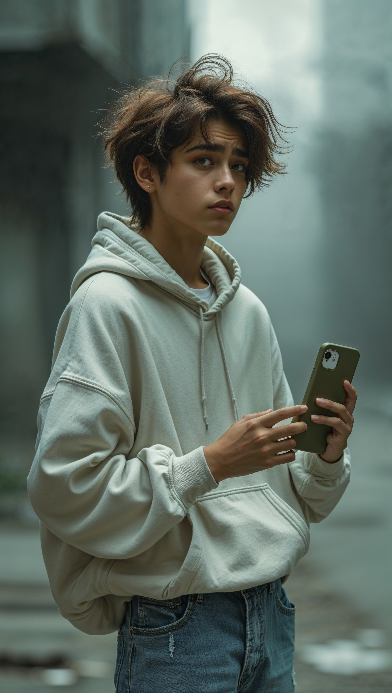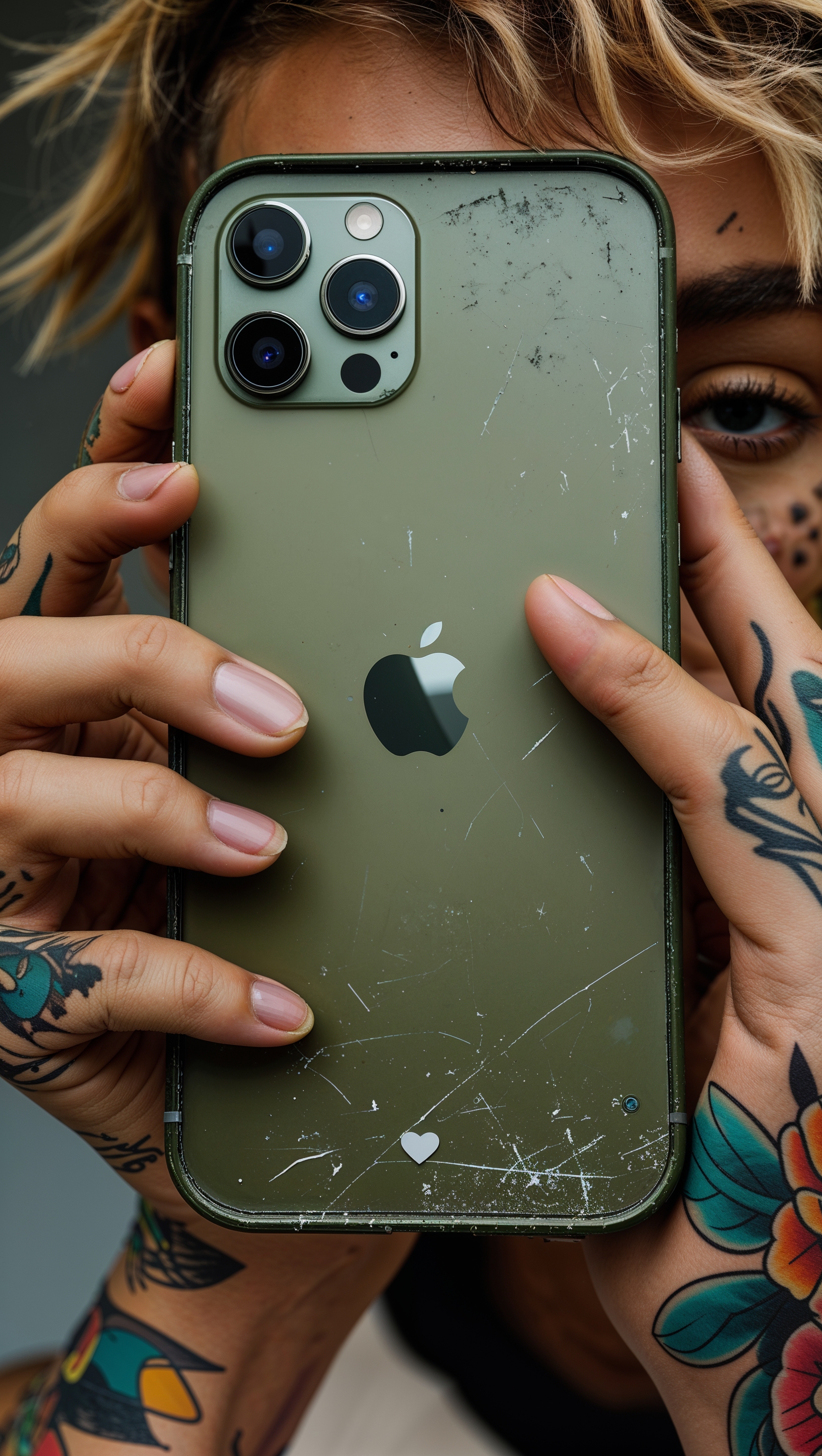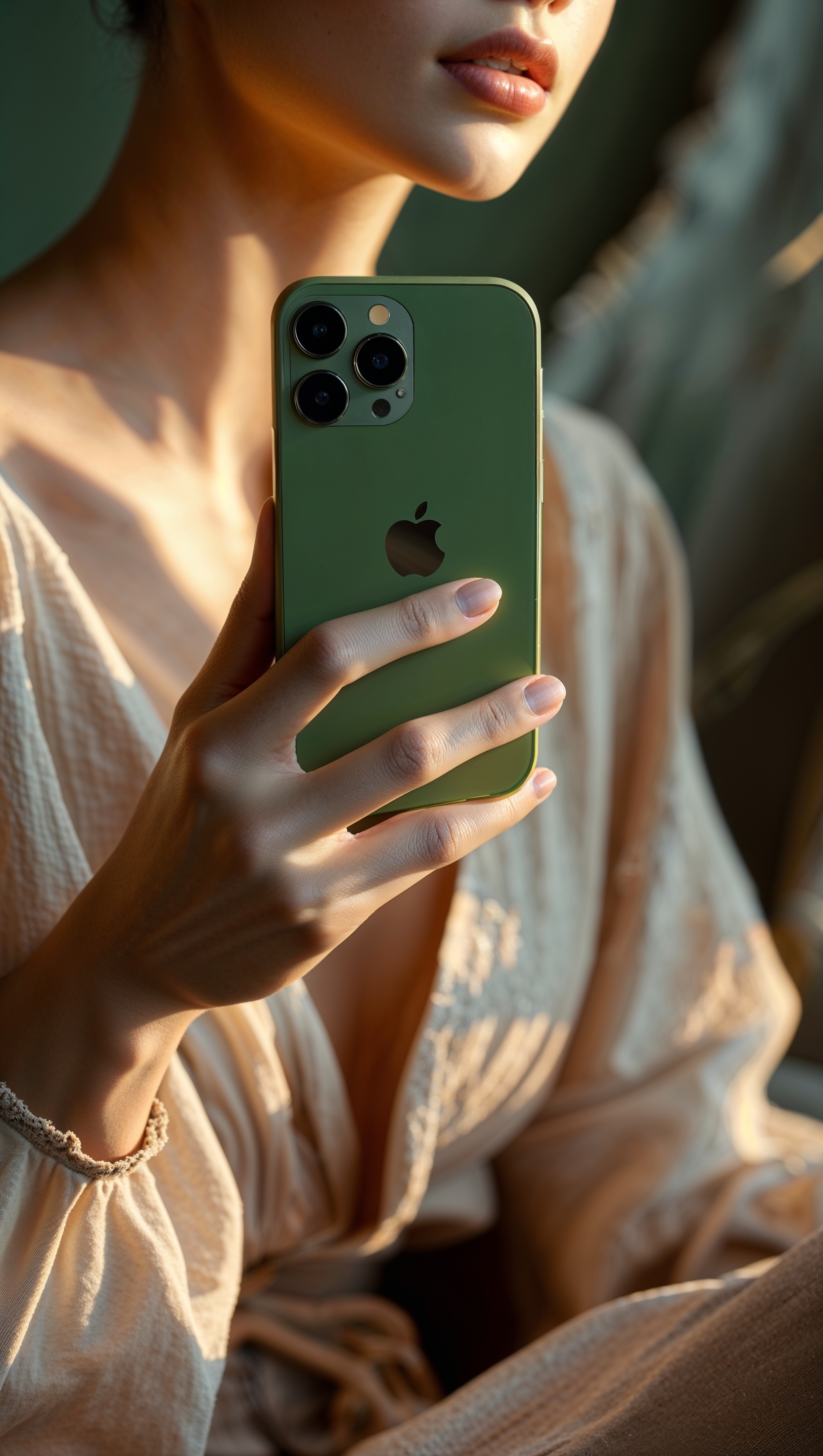 1664x2944 Olive green iPhone in a woman's hand under natural light
