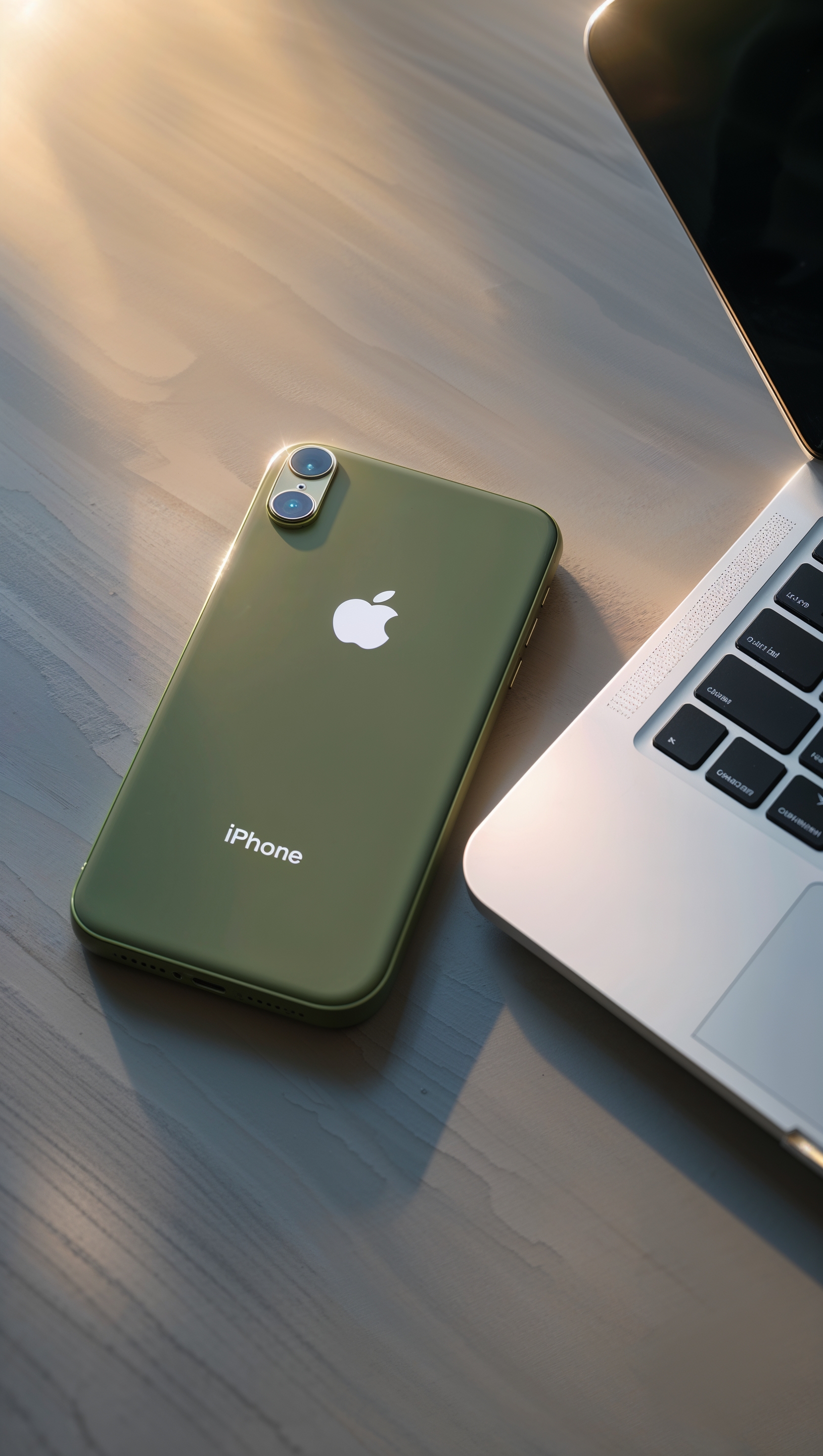 1664x2944 Olive green iPhone next to a MacBook laptop