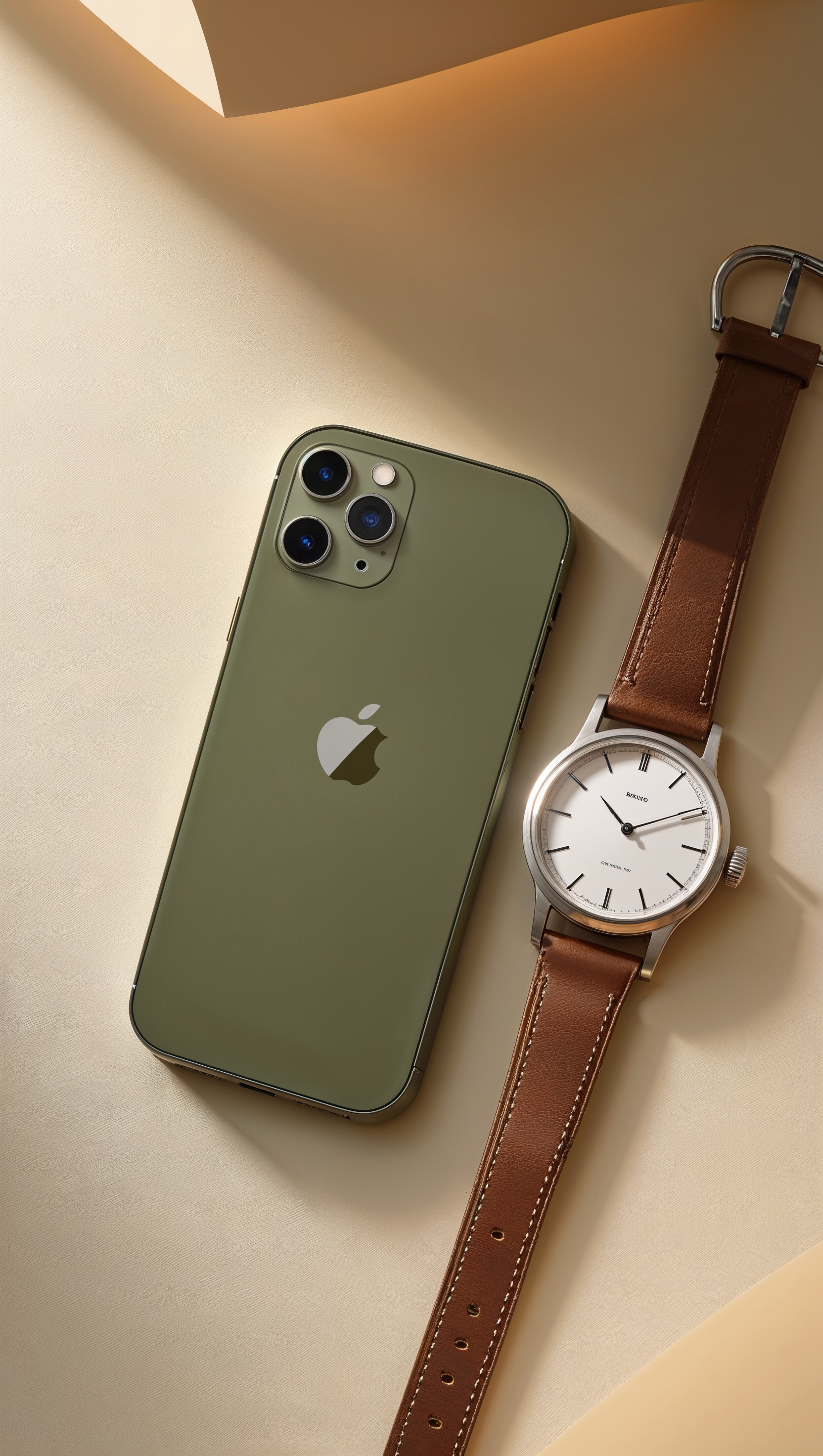 1664x2944 Olive green iPhone next to a classic wristwatch